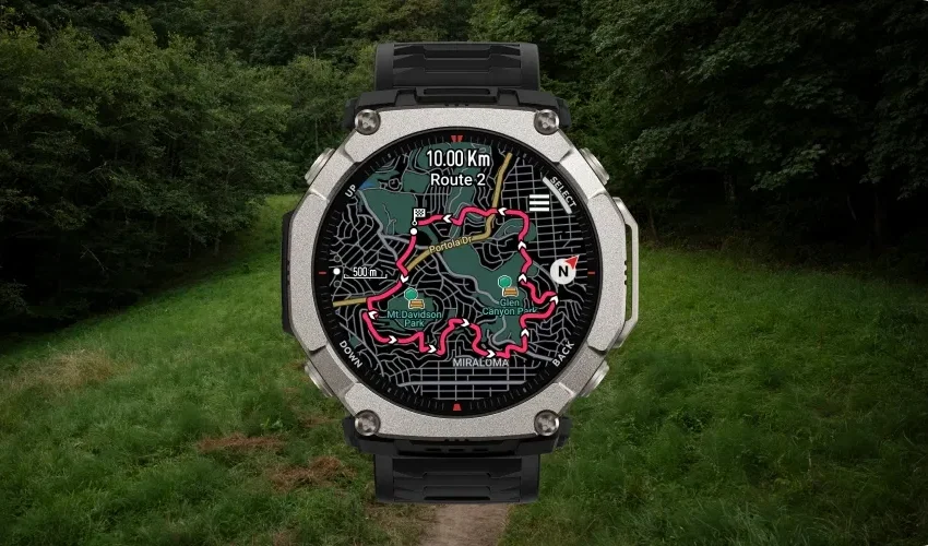 Nowy smartwatch Amazfit wyposażono w 1,5-calowy ekran AMOLED o rozdzielczości 480×480 pikseli i jasności sięgającej 3000 nitów. To parametr, który ma znaczenie w terenie, a szczególnie podczas korzystania z map i nawigacji w pełnym słońcu. Ekran dodatkowo chroniony jest szkłem szafirowym. Istotną częścią możliwości T-Rex Ultra 2 są mapy dostępne offline. Zegarek oferuje fabrycznie wgrane mapy topograficzne oraz możliwość pobierania bezpłatnych map konturowych i stoków narciarskich, które rozróżniają drogi utwardzone i szlaki gruntowe. Po synchronizacji działają bez internetu, co ma kluczowe znaczenie podczas wypraw. Urządzenie korzysta z wielu systemów satelitarnych, co przekłada się na dokładniejsze pozycjonowanie oraz wygodniejsze planowanie tras czy wyszukiwanie punktów POI.