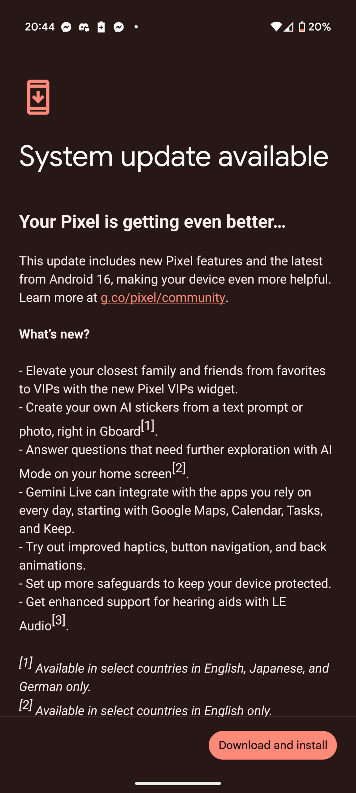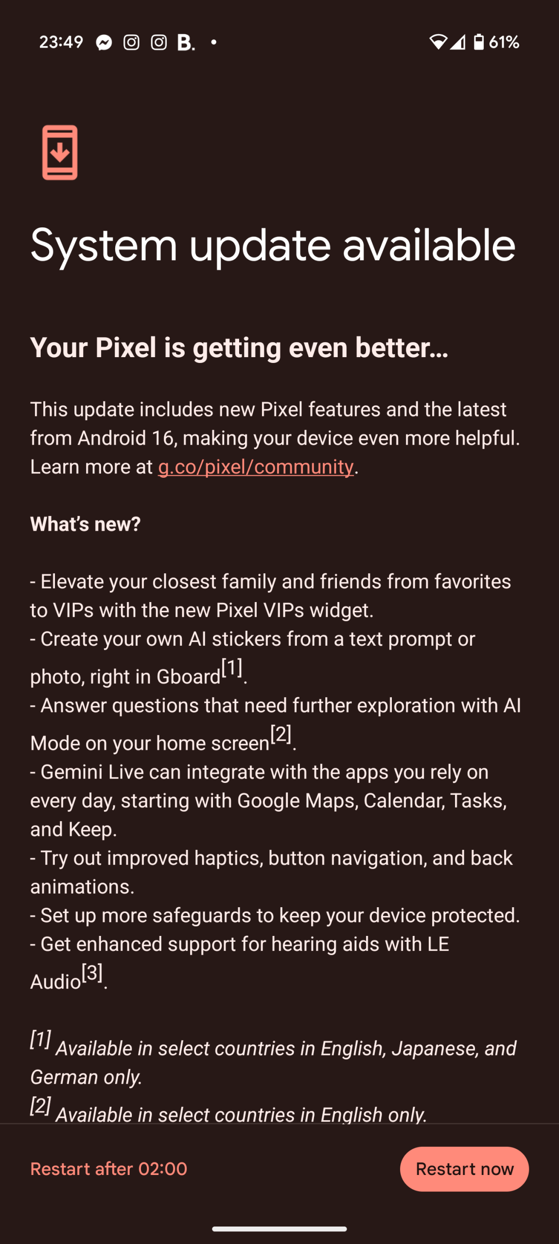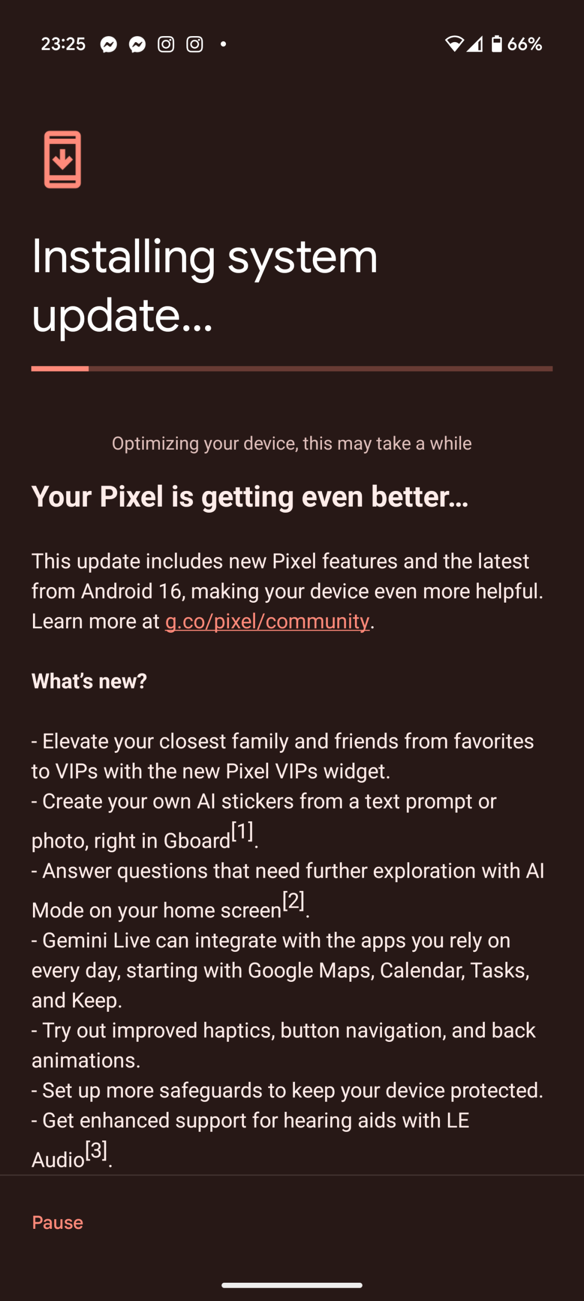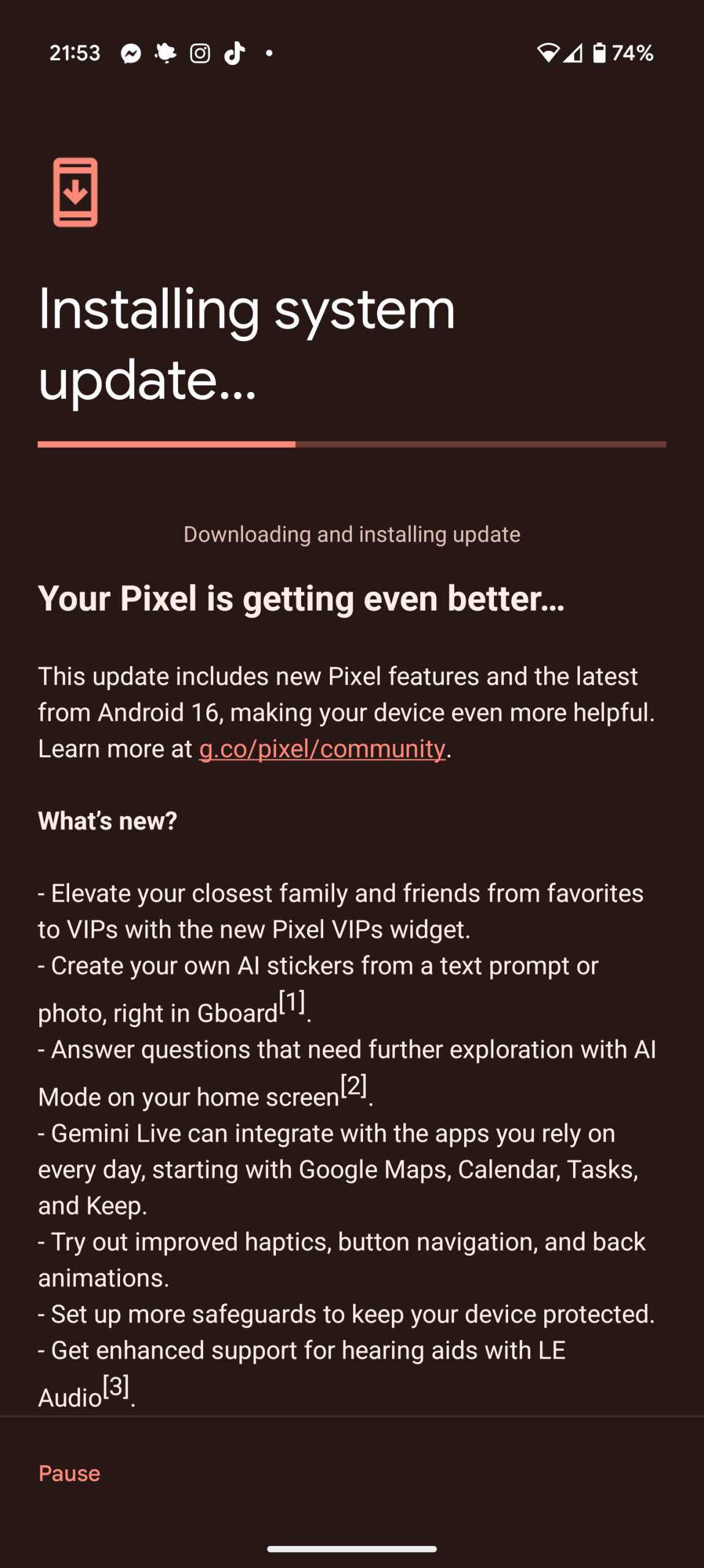 Jako użytkownik Google Pixela 9 Pro XL, mogłem sam już pierwszego dnia dokonać aktualizacji do Androida 16. O tym, że aktualizacja ma przyjść wczoraj wiedziałem od rana, więc cierpliwie wyczekiwałem. Około godziny 20:45 dowiedziałem się z Facebooka, że update już krąży, więc pora było zacząć zabawę. Zabawa się przedłużyła, bo niski poziom naładowania baterii nie pozwolił mi na instalację aktualizacji, a wolny internet też nie był pomocny mimo, że to jedynie 1,48 GB. Podłączyłem telefon do ładowania, później sobie przypomniałem o aktualizacji i ją kontynuowałem. Cały proces dobiegł końca niedługo przed północą.