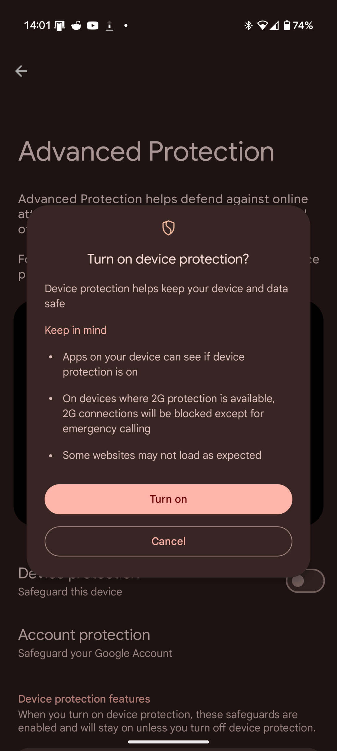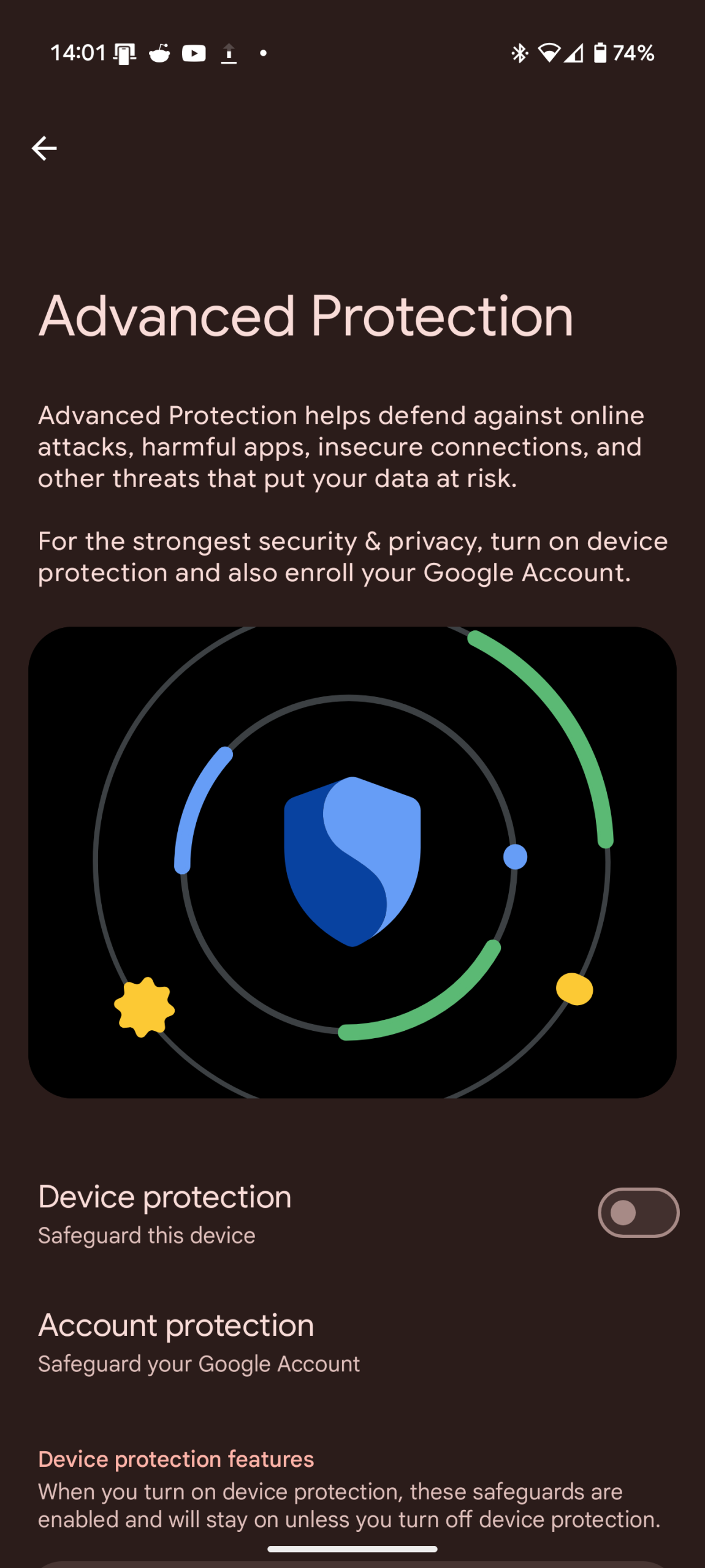 Ochrona zaawansowana to nowa sekcja ustawień prywatności i bezpieczeństwa, która daje nam nowe możliwości ochrony urządzenia, takie jak skanowanie podejrzanych stron internetowych, aplikacji, czy blokowanie przestarzałej i niebezpiecznej sieci 2G z wyjątkiem połączeń alarmowych.