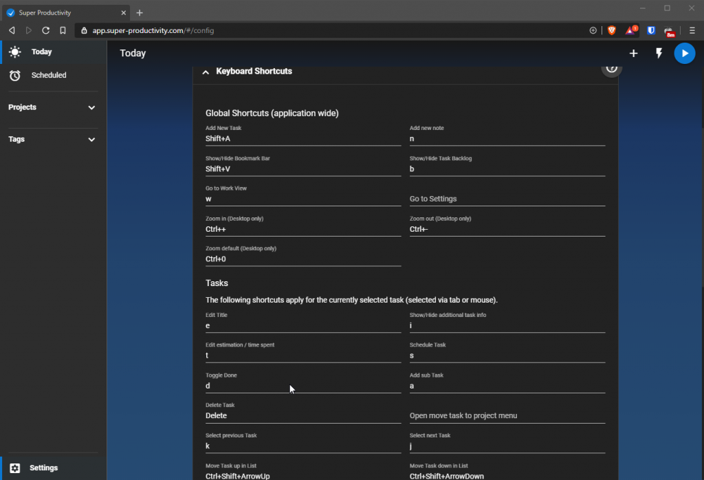 Oczywiście Super Productivity daje możliwość tworzenia oddzielnych projektów, a także tagów – jest to wręcz podstawa w tego typu aplikacjach. W ustawieniach natomiast znajdziemy wiele przydatnych rzeczy. Przede wszystkim możemy ustawić własne skróty klawiszowe (a jest ich naprawdę wiele), dodać przypomnienia o przerwach, a nawet zmienić ustawienia licznika czasu Pomodoro.