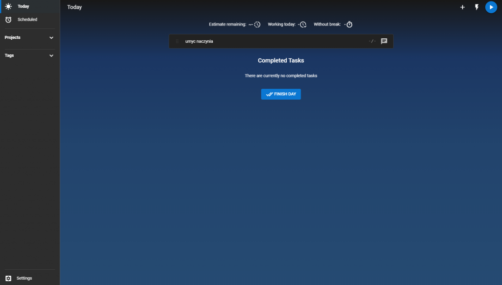 Kiedy wchodzimy na stronę główną aplikacji to od razu widzimy naszą listę zadań, ale tylko ją bez zbędnych ozdobników. Dodatkowo znajdziemy tam przycisk do dodawania kolejnych zadań oraz przycisk Play. Jest to coś niezbyt częstego w tego typu aplikacjach, ale jakże przydatnego. Po kliknięciu tego przycisku rozpocznie się odliczanie czasu, które przyznamy na dane zadanie. Jest to naprawdę przydatne i w podobny sposób zmusza nas do pracy jak tak zwane liczniki czasu Pomodoro.