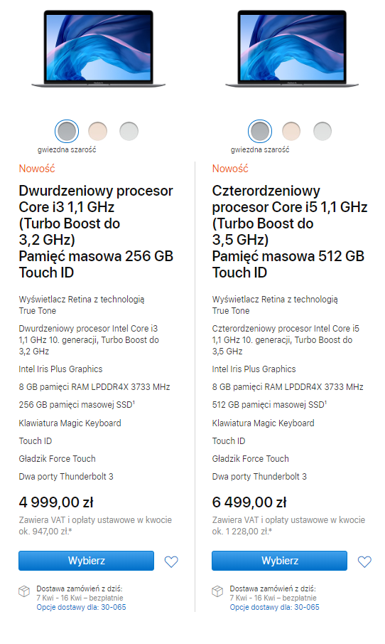 Tak naprawdę nowego MacBooka Air już teraz można zamówić na stronie Apple. Dostawa powinna mieć miejsce pomiędzy 7 a 16 kwietnia tego roku. Oczywiście różne czynniki mogą wpłynąć na opóźnienie, ale myślę, że do końca kwietnia wszystkie osoby, które zdecydują się na zakup otrzymają swoje laptopy. Co z cenami? Za podstawowy wariant z dwurdzeniowym procesorem Intel Core i3 10. generacji, 8 GB RAM-u oraz 256 GB pamięci wewnętrznej trzeba zapłacić w naszym kraju 4999 zł. Dopłata do czterordzeniowego Intel Core i5 wynosi 500 zł, a do Intel Core i7 1250 zł. Wersja z 16 GB RAM-u to dodatkowo koszt 1000 zł, a za większe dyski SSD trzeba dopłacić odpowiednio: 1000 zł za 512 GB, 2000 zł za 1 TB oraz 4000 zł za 2 TB. Tym samym najdroższy możliwy wariant to wydatek rzędu 11249 zł.