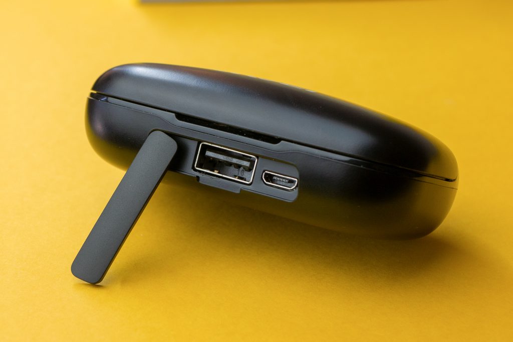 Jednak to nadal nie wszystko. Pokrowiec został wyposażony w port microUSB, służący do ładowania samych słuchawek, oraz USB-A. Dzięki USB-A etui to może stać się niewielkim przenośnym bankiem energii ładującym inne urządzenia. Wprawdzie nie doświadczymy szybkiego ładowania, ale w sytuacji kryzysowej może okazać się to wręcz genialnym rozwiązaniem.