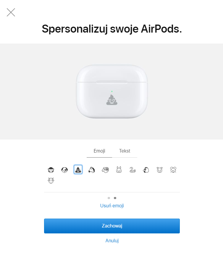 Grawerowanie napisów na Apple AirPods czy AirPods Pro było możliwe już wcześniej. Teraz gigant z Cupertino idzie o krok dalej i pozwala na jeszcze większą personalizację swoich słuchawek bezprzewodowych. Marzyliście o tym, aby na pokrowcu znalazło się wasze ulubione emoji? Jeśli tak to mamy dla was świetną informację!