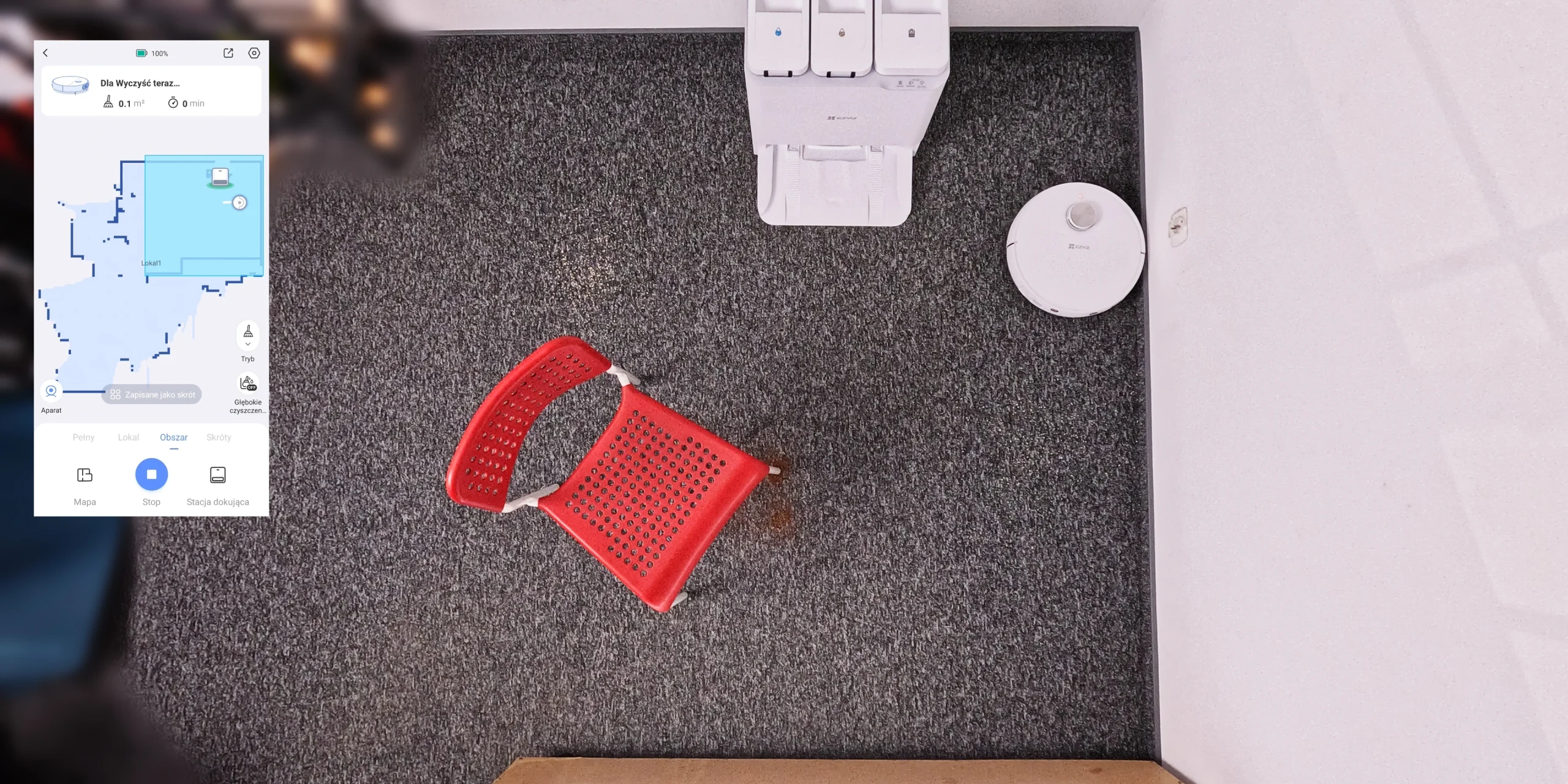 Stacja bazowa imponuje dużą pojemnością: 5-litrowy zbiornik na czystą wodę, 5-litrowy na brudną wodę oraz 5-litrowy worek na śmieci, który wystarcza na 4-5 miesięcy użytkowania. Automatyczne mycie mopów ciepłą wodą (55°C) i suszenie gorącym powietrzem ogranicza rozwój bakterii, dodatkowo możliwość uruchomienia czyszczenia stacji bazowej. Mimo zalet, wymiary stacji (45 × 38 cm) sprawiają, że lepiej prezentuje się w pomieszczeniach gospodarczych niż w salonach. Stacja bazowa cechuje się futurystycznym designem, który może też wpasować się w nowoczesne wnętrza – ostatecznie jak zawsze to kwestia gustu i indywidualnych preferencji.