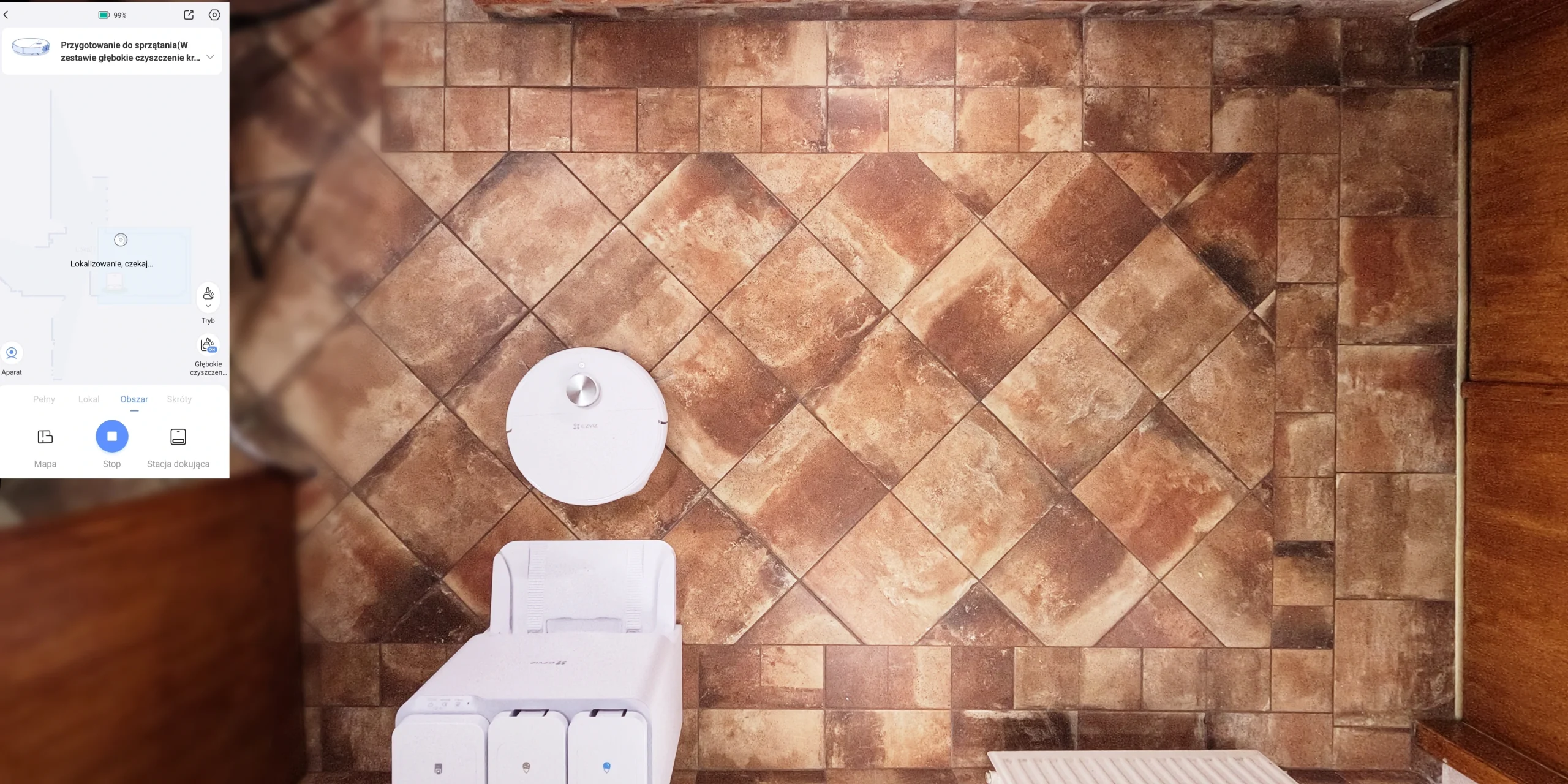 W symulowanym teście z kawą, kaszą i włosami robot zwiększył siłę ssania do 7200 Pa, jednocześnie zwalniając obroty miotełek, by nie rozrzucać zabrudzeń. System “antyplątania” sprawdził się znakomicie – szczotka pozostała drożna nawet po kontakcie z długimi włosami. Na dywanach czujniki automatycznie wyłączyły mopy, podnosząc jednocześnie miotełki. Problemem okazało się mopowanie przy krawędziach – mimo bocznych wychyleń (tzw. ruch „swing”), robot pozostawiał wąskie, suche pasma w rogach pomieszczeń.
