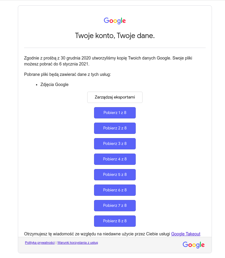Na dzisiaj w tym momencie możemy skończyć, bowiem musi minąć kilka dni (w moim przypadku około 24 godziny) kiedy to gigant zarchiwizuje nasze dane i przekaże je do pobrania. Po jakimś czasie na naszego maila przyjdzie wiadomość z bezpośrednimi linkami do pobrania danych. UWAGA: w zależności od ilości danych i wybranej wielkości pliku, nasze dane mogą być dostępne w kilku częściach.
