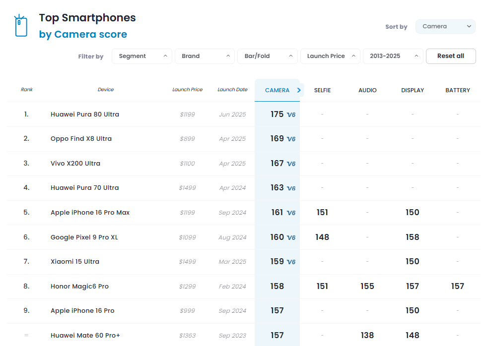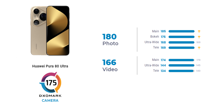 Wynik 175 punktów, jaki uzyskał Huawei Pura 80 Ultra, to nie tylko nowy rekord DxOMark, ale też 12 punktów więcej niż osiągnął Pura 70 Ultra w ubiegłym roku. Tym samym smartfon wyprzedził Vivo X200 Ultra oraz Oppo Find X8 Ultra, które w ostatnich miesiącach zdążyły już przejąć pozycję lidera.