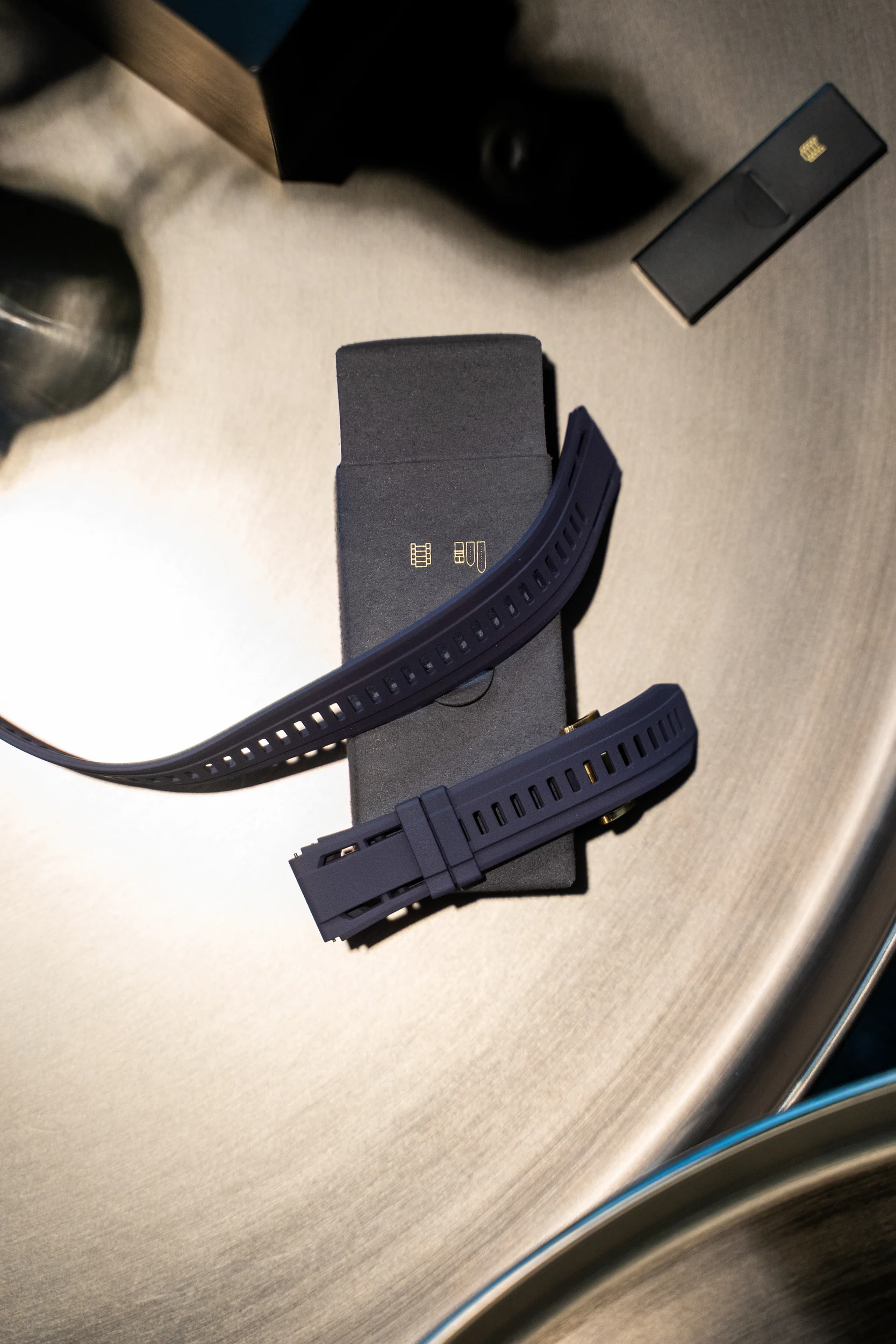W pudełku znajdziemy też pasek z fluoroelastomeru (uwielbiam tę nazwę) oraz przedłużony pasek do nurkowania – bo tak, zegarek nie został uszczuplony o żadną z funkcji, więc kto zabroni Ci nurkować ‘w złocie’?