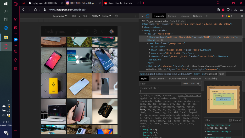 Interesuje nas przycisk podpisany w Operze jako Toggle device toolbar z ikoną tabletu i smartfona. Zmienia on widok strony na mobilną. W ten sposób jesteśmy już praktycznie u celu. Ostatnim krokiem jest odświeżenie strony, aby pojawił się u dołu przycisk z plusikiem służący do dodawania zdjęć. Po zakończeniu tego procesu możecie zmienić z powrotem na “właściwy” tryb strony Instagrama w przeglądarce.