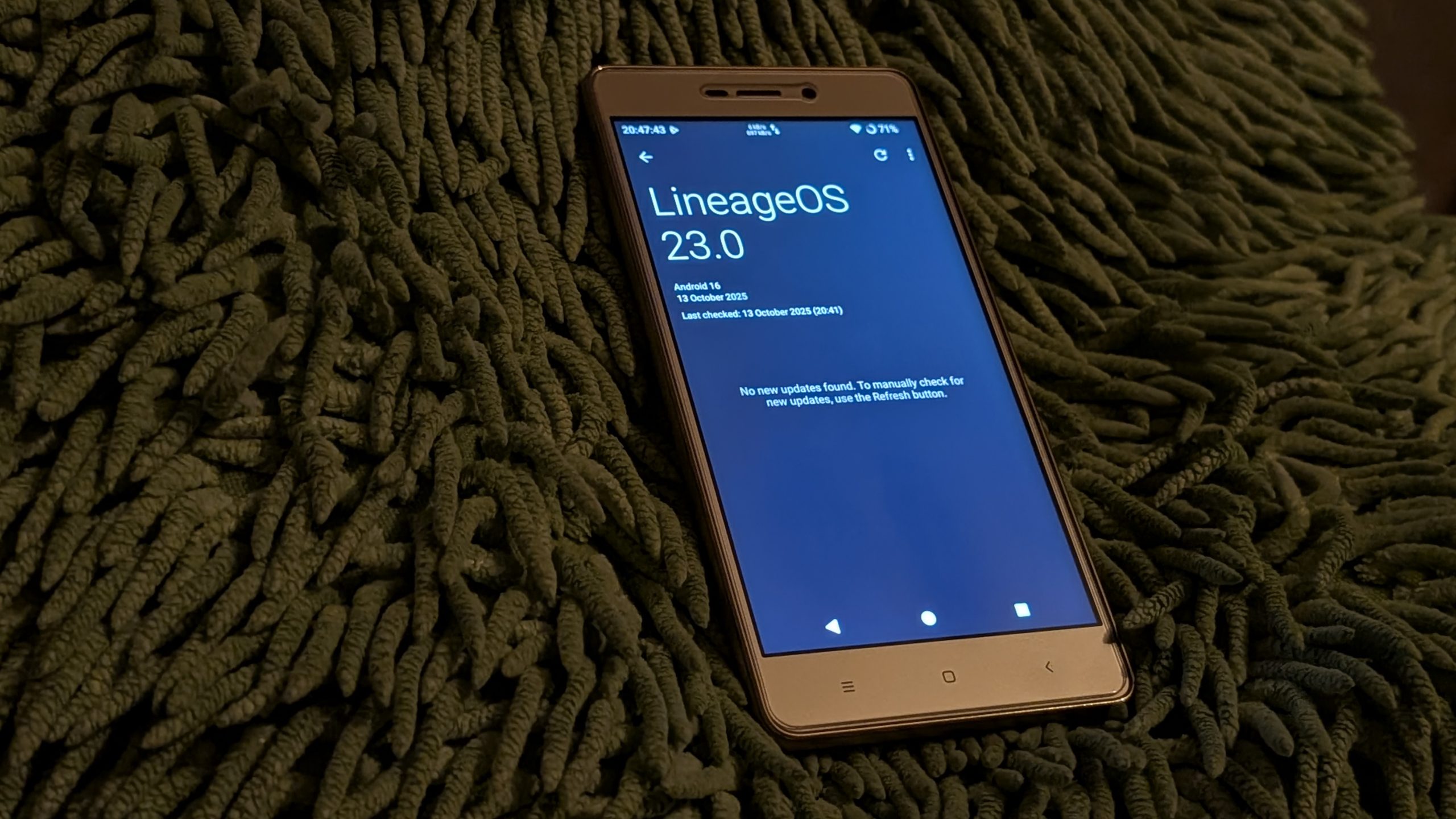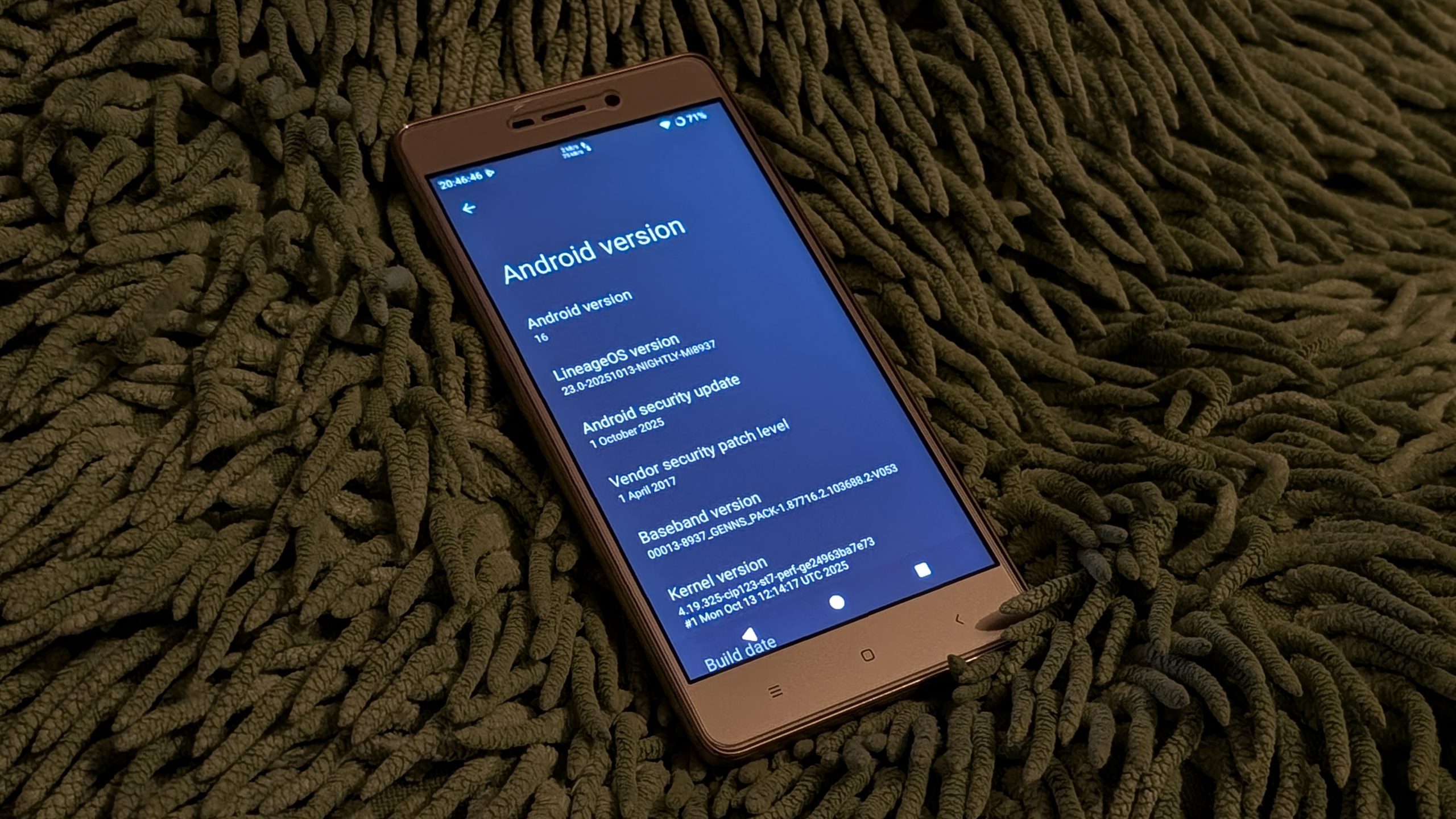 Dziś (13.10.2025) do pierwotnej wersji systemu doszła jedynka z przodu, dzięki czemu mogłem na swoim blisko 10-letnim budżetowcu zainstalować Androida 16. Instalacja systemu poszła bez problemów, dorzuciłem również usługi Google z paczki od NikGapps, bo pakiety instalacyjne LineageOS ich zawierają (lub jak kto woli – są od nich wolne). Wyjątkowo po instalacji zauważyłem ciekawy błąd. System bez względu na zmienione ustawienie, wyświetla przyciski nawigacji na ekranie, mimo, że urządzenie posiada przyciski pojemnościowe pod ekranem. Ekranowy przycisk cofania wywala mnie do ekranu blokady, a pozostałe dwa działają normalnie. Podejrzewam jednak, że błąd zostanie szybko naprawiony, nowe kompilacje LineageOS dla wspieranych urządzeń pojawiają się zwykle co tydzień, więc nie jest tak źle.