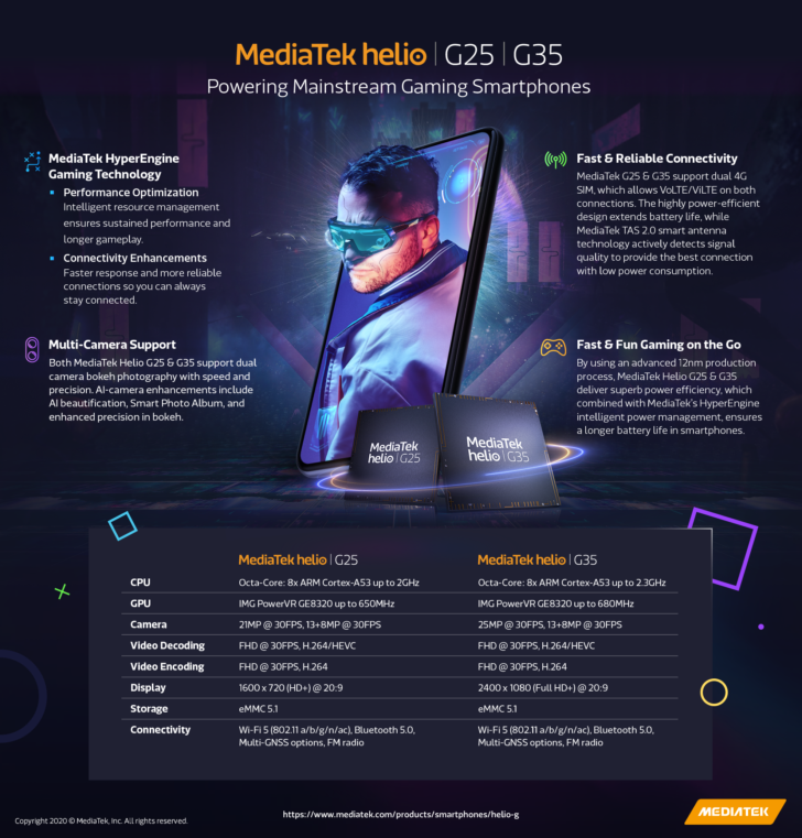 Nowości MediaTeka zostały wykonane w 12 nm procesie technologicznym. Co ciekawe oba nowe procesory tajwańskiego producenta oparte są na ośmiu rdzeniach ARM Cortex-A53. W przypadku MediaTeka Helio G25 maksymalne taktowanie na rdzeniu to 2 GHz, a Helio G35 oferuje taktowanie 2,3 GHz, a co za tym idzie, przynajmniej w teorii, powinien zaoferować on lepszą wydajność zarówno w codziennym użytkowaniu jak i grach. W obu nowych procesorach znajdziemy także dokładnie ten sam układ graficzny czyli IMG PowerVR GE8320. Tutaj także możemy jednak mówić o różnicy w taktowaniu. Helio G25 oferuje częstotliwość taktowania 650 MHz, a Helio G35 680 MHz.