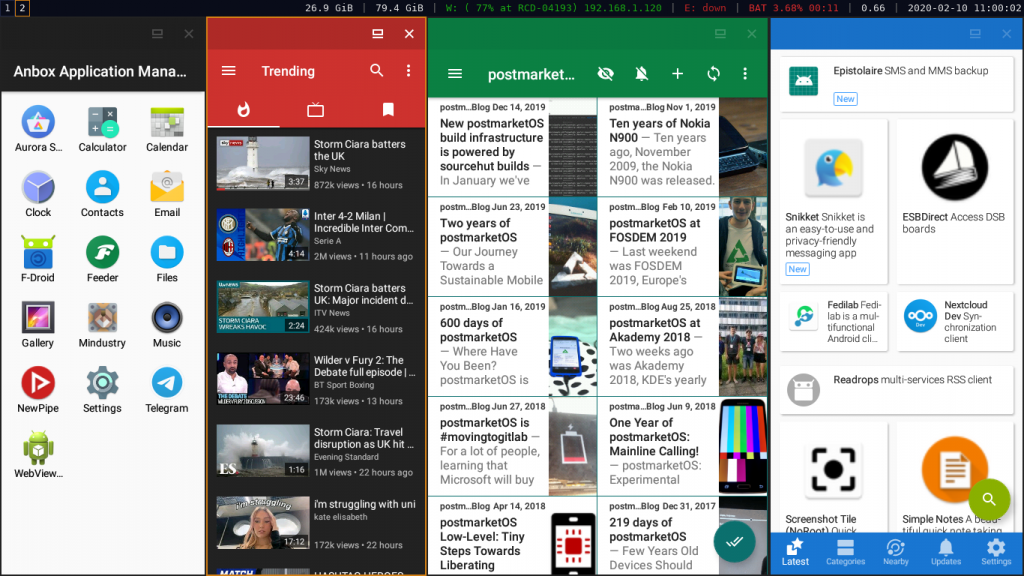 Bardzo ciekawym narzędziem jest Anbox – specjalny layer (coś w stylu Wine), który pozwala na uruchamianie aplikacji z Androida na innych systemach. Póki co jest on dostępny tylko na urządzenia z procesorami x86, jednak przepisanie go na ARM nie powinno być problemem. Według najnowszego wpisu deweloperów, Anbox działa całkiem dobrze na PostmarketOS, co daje nam powody do myślenia, że dzięki temu programowi będziemy mogli uruchamiać aplikacje z Androida. To również (prawdopodobnie) zażegna problemy związane z brakiem mobilnych aplikacji na Linuxa.