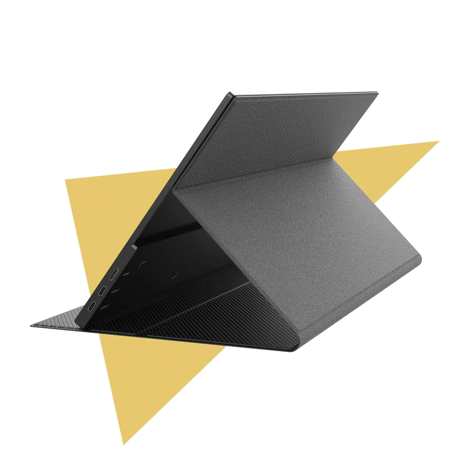 Jedną z największych zalet konstrukcji jest jej mobilność. Sam ekran wraz z magnetycznym etui waży około 1,1 kg, a jego obudowa ma zaledwie około 15 mm grubości. Wymiary wynoszą mniej więcej 356×226 mm, dzięki czemu monitor bez większego problemu powinien zmieścić się w torbie lub plecaku razem z laptopem. Dołączone etui spełnia podwójną funkcję, ponieważ podczas transportu chroni ekran przed zarysowaniami, natomiast po rozłożeniu pełni rolę podstawki. Pozwala ona ustawić monitor zarówno w orientacji poziomej, jak i pionowej, co może być przydatne na przykład podczas pracy z dokumentami czy kodem.