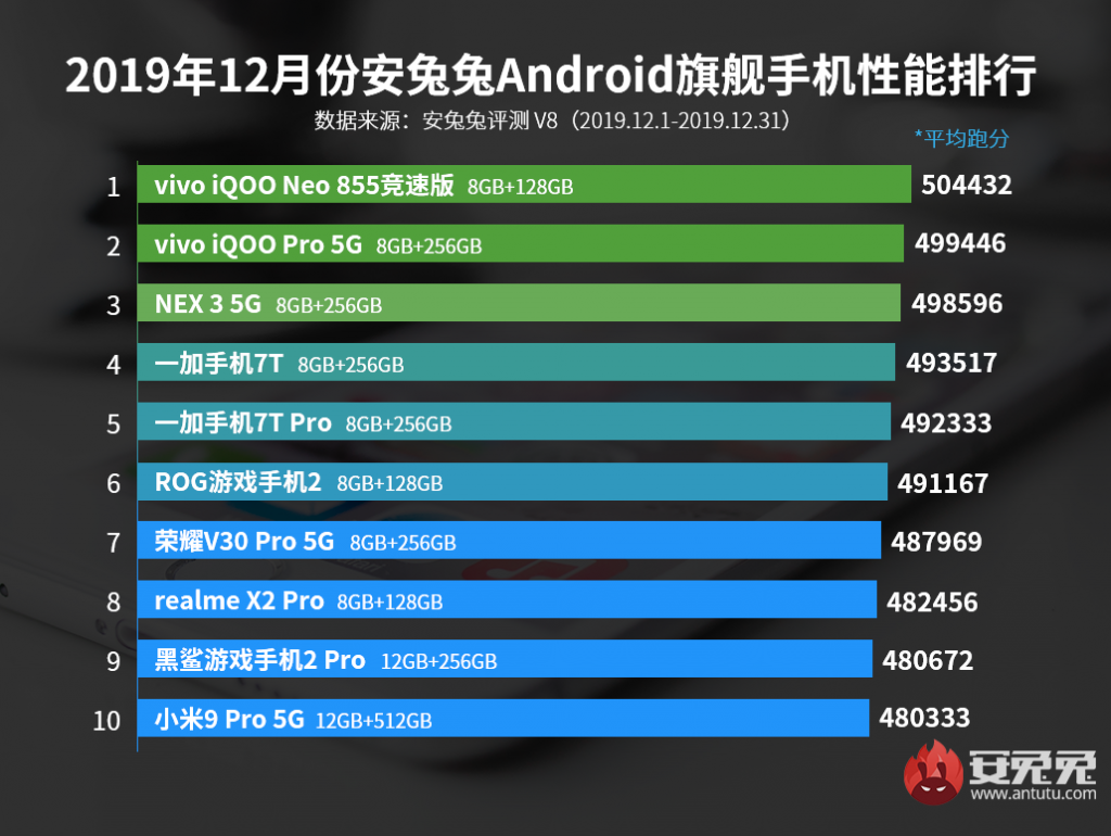 Co ciekawe numerem jeden grudniowego zestawienia AnTuTu został Vivo iQOO Neo 855, który zdobył 503432 punkty. Już jakiś czas temu chiński producent przyznał, że seria ta ma być stworzona z myślą o użytkownikach potrzebujących niesamowitej wydajności i wszystko wskazuje na to, że zapewnienia firmy odnajdują odzwierciedlenie w rzeczywistości. Drugie miejsce należy do Vivo iQOO Pro 5G (499446 punktów). I to właśnie gigant z Państwa Środka zdominował podium w grudniowym zestawieniu przygotowanych przez AnTuTu. Miejsce trzecie zajął bowiem Vivo Nex 3 5G z wynikiem 498596 punktów.