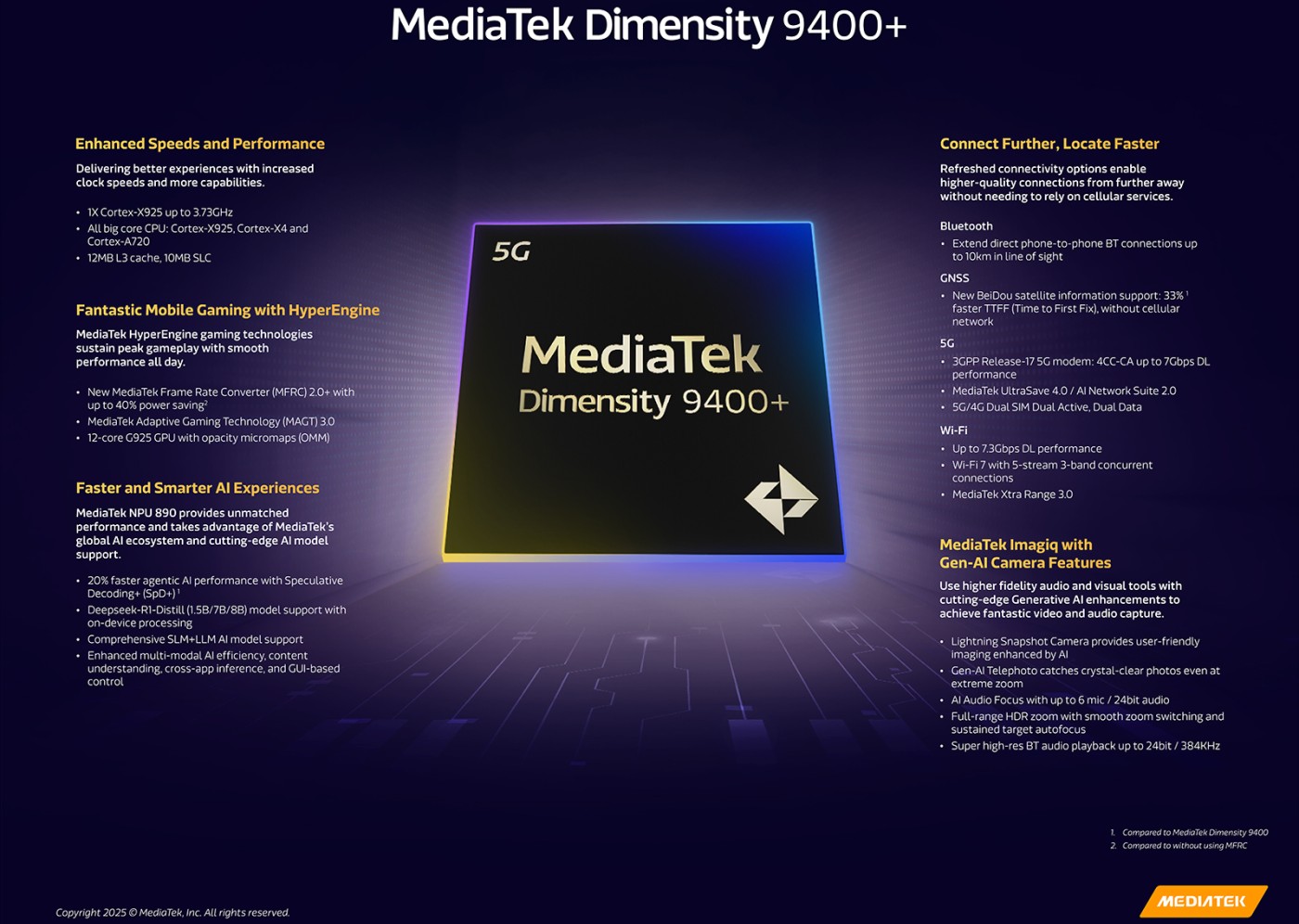 Dimensity 9400+ to także poprawki w zakresie łączności. Na pokładzie znajdziemy technologię MediaTek UltraSave 4.0, która inteligentnie zarządza zużyciem energii podczas korzystania z sieci 5G. Producent deklaruje, że udało się uzyskać nawet 18% oszczędności energii w porównaniu do poprzedniej wersji, co w połączeniu z nowym procesem litograficznym daje naprawdę solidny wynik.