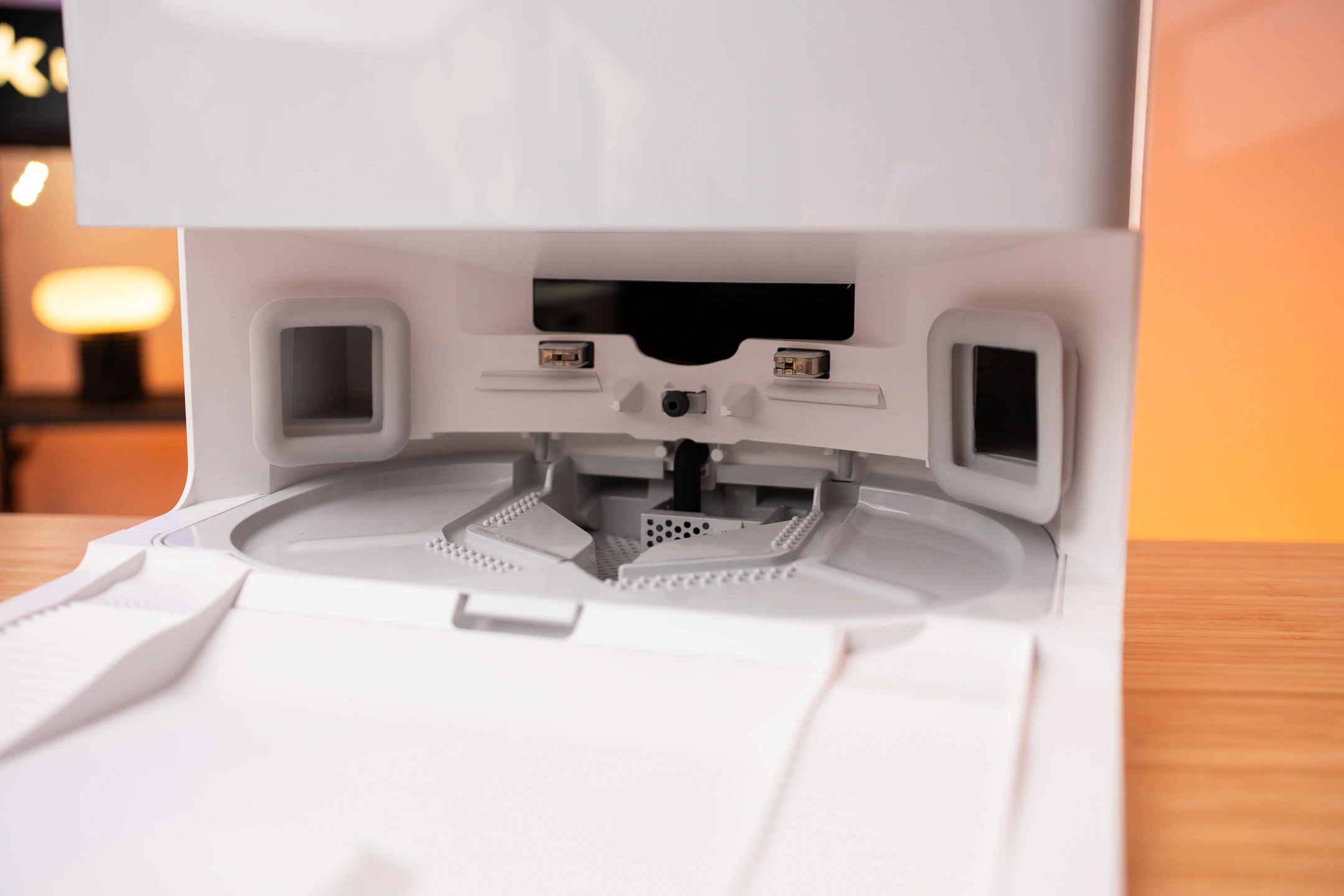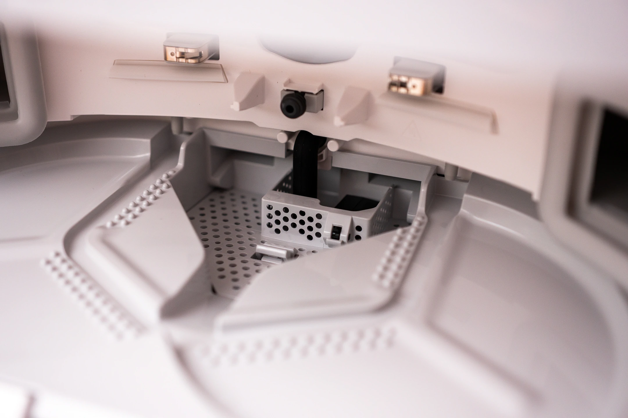 Górna część stacji mieści dwa zbiorniki: na czystą i brudną wodę oraz worek na odpady, który przy standardowej eksploatacji należy zmieniać raz na 2-3 miesiące. Tak kompleksowa automatyzacja pozwala nam praktycznie całkowicie zapomnieć o codziennej obsłudze urządzenia.