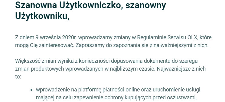 Jeśli kiedykolwiek korzystaliście z usług OLX, to pewnie wczoraj, bądź dziś otrzymaliście email. Ja otrzymałem go wczoraj i początkowo zignorowałem go jak wiele wiadomości, które mnie atakują z każdej strony. Później coś mnie jednak tknęło, żeby sprawdzić dokładniej swoją pocztę i w razie czego usunąć niepotrzebne maile. Dowiedziałem się dzięki temu czegoś ciekawego, mianowicie OLX szykuje dużo zmian w regulaminie. Szczególnie interesująca jest ta, która została wymieniona na liście jako pierwsza.