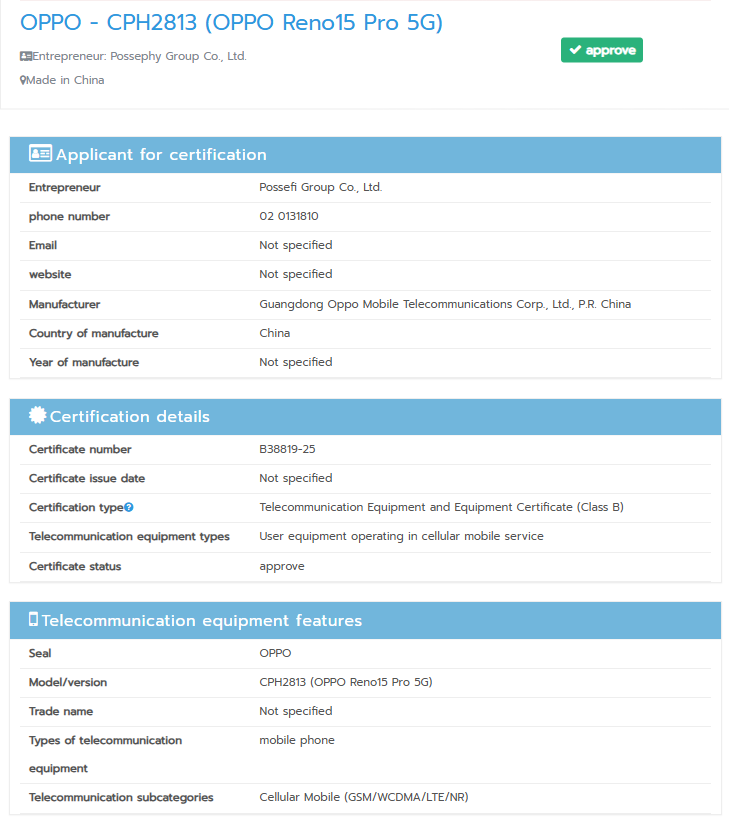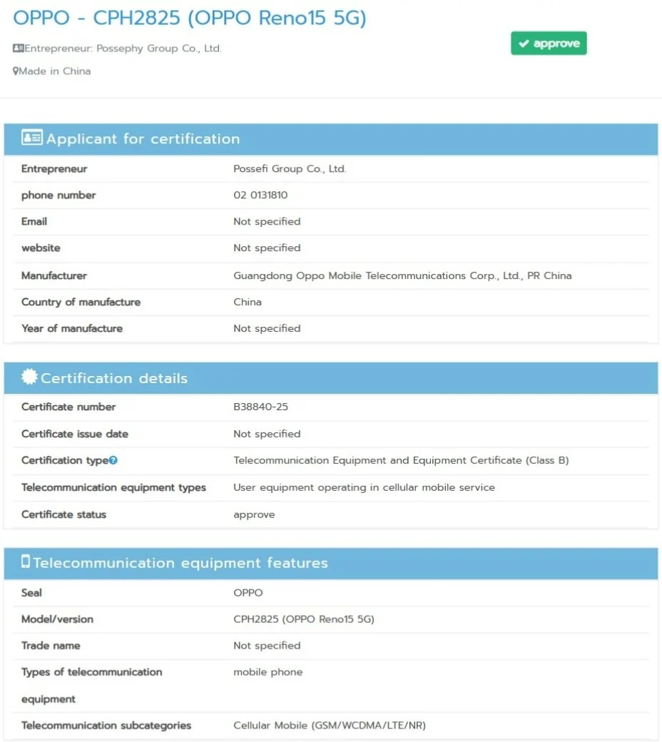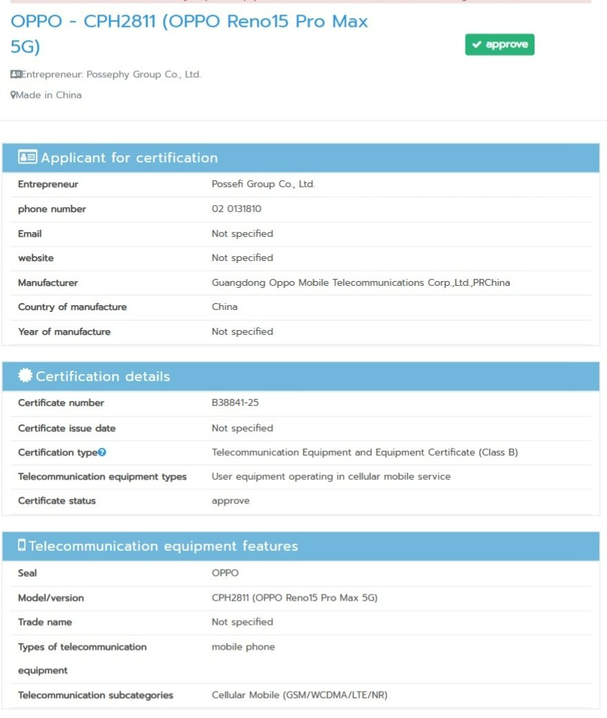 Sytuacja uległa zmianie, gdy w tajlandzkim urzędzie NBTC oficjalnie zarejestrowano model OPPO Reno 15 Pro Max o oznaczeniu CPH2811. Co więcej, w tym samym zestawieniu pojawiły się również Reno 15 (CPH2825), Reno 15 Pro (CPH2813) oraz Reno 15F (CPH2801). Seria licząca cztery smartfony nabiera więc realnych kształtów, a certyfikacje kilku niezależnych agencji potwierdzają ich istnienie.