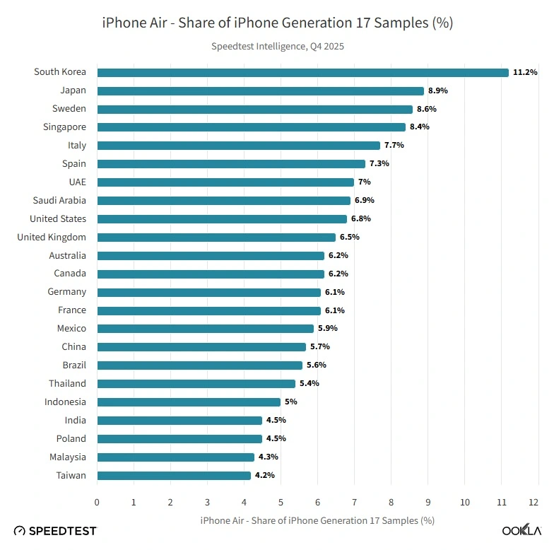 Co więcej, iPhone Air okazał się również wyraźnie mocniejszy od bezpośredniego rywala, czyli Samsunga Galaxy S25 Edge. W Stanach Zjednoczonych przewaga Apple wynosiła mniej więcej trzy do jednego, a w Europie smartfon Samsunga praktycznie nie zaistniał i jego udział w niektórych krajach nie przekraczał nawet 1%. Nawet jeśli oba urządzenia trudno nazwać bestsellerami, to Apple wyszło z tego pojedynku zdecydowanie mniej poturbowane.