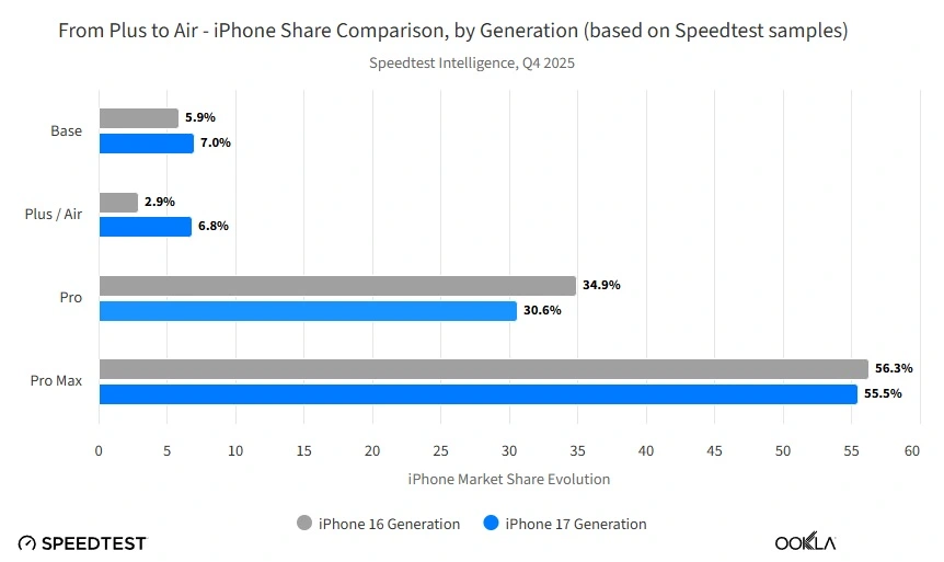 Kluczowe jest jednak porównanie z poprzednią generacją. iPhone 16 Plus, którego Air de facto zastąpił, rok wcześniej osiągnął zaledwie 2,9% udziału. Oznacza to, że nowy model jest ponad dwukrotnie popularniejszy od swojego poprzednika, co jasno pokazuje, że decyzja Apple o zmianie strategii miała sens.