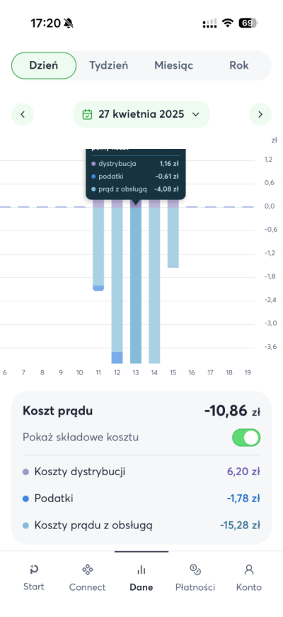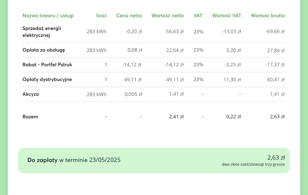 Stawki dynamiczne mają jeszcze jedną zaletę. Sporadycznie są dni gdzie prąd na giełdzie jest sprzedawany po cenach ujemnych. Oznacza to, że za każdą zużytą kWh nasz rachunek się zmniejsza. Dlaczego się tak dzieje? W dużym skrócie “bo tak jest taniej”. Łatwiej jest dopłacić do kWh i zachęcić do odbioru niż wstrzymywać pracę elektrowni na kilka godzin. Do tego w słoneczne dni nadwyżka prądu która trafia do sieci pochodzi też od osób które mają założoną fotowoltaikę. Wtedy w taryfie dynamicznej faktycznie możemy zmniejszyć sobie rachunek. Rekord jaki udało mi się osiągnąć to prawie -11 zł za kilka godzin ładowania samochodu i to było już po wszystkich opłatach dystrybucyjnych oraz opłatach za obsługę w Pstryku. Tak te opłaty przy stawkach ujemnych po prostu są pokrywane z tego co “zarobimy”. Pamiętajcie, że Pstryk jako sprzedawca prądu zarabia na opłacie za obsługę (0,08 zł za każdą kWh). Oddzielnym stałym kosztem jest opłata za dystrybucję, która trafia do Waszego dystrybutora. Natomiast jeśli prąd kosztuje np. -0,50 zł to wystarcza na pokrycie tych opłat, a stawka całkowita pozostaje nadal ujemna.