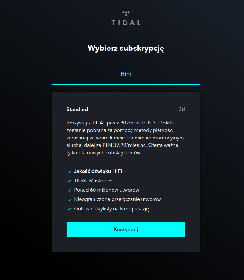 Proces kupienia 90 dni konta HiFi w Tidal jest bardzo prosty. Aby skorzystać z okazji, należy wejść na >tę stronę< i zarejestrować się w usłudze (promocja jest dostępna tylko dla nowych użytkowników). Następnie trzeba uruchomić subskrypcję premium HiFi podając numer karty płatniczej. Z konta bankowego powinno zniknąć 3 złote. Po minięciu 90 dni usługa automatycznie pobierze środki z Waszego konta (standardowo 39,99 PLN) – aby tego uniknąć należy od razu anulować subskrypcję premium.