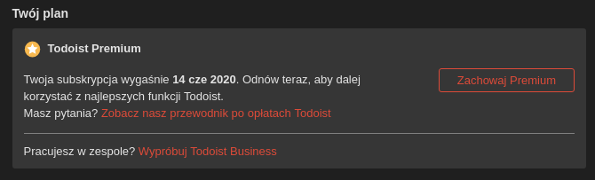 Z Todoist korzystałem kilka lat, ale niestety musiałem się z nią rozstać. Powodem tego był fakt, że skończyła mi się subskrypcja premium i nie było mowy o jej przedłużeniu. Do tej pory udawało mi się ją przedłużać w sposób darmowy, między innymi kodami bonusowymi oraz instalacją aplikacji na przeróżnych urządzeniach (użytkownicy smartfonów Huawei niegdyś dostawali darmową “premkę”), a w zasadzie na moim prywatnym Huawei P9.