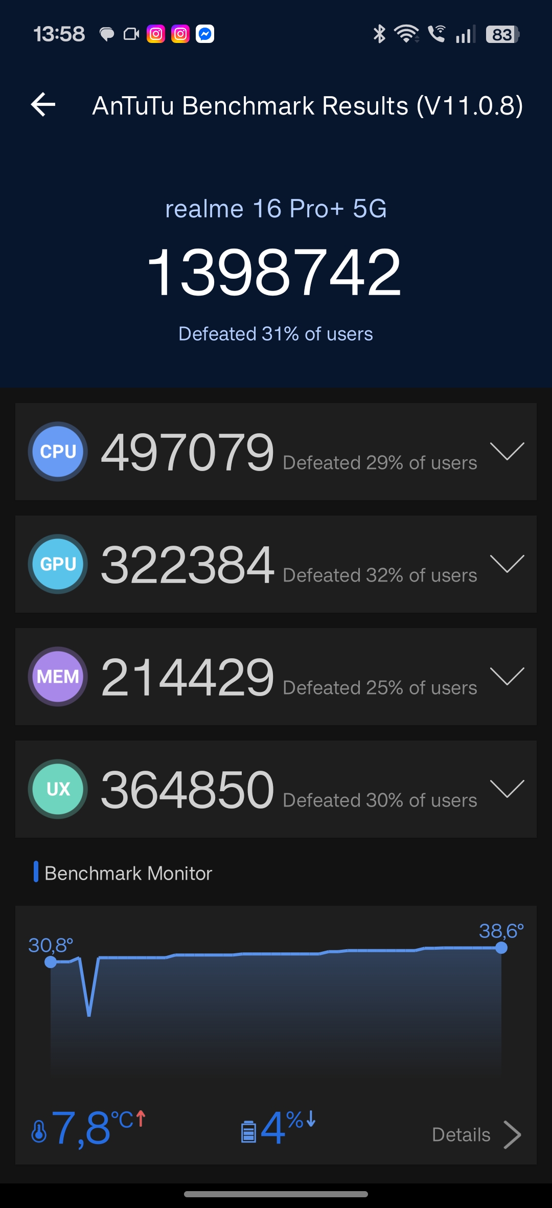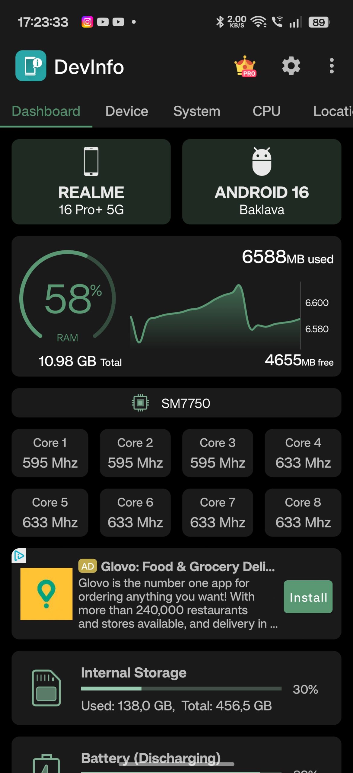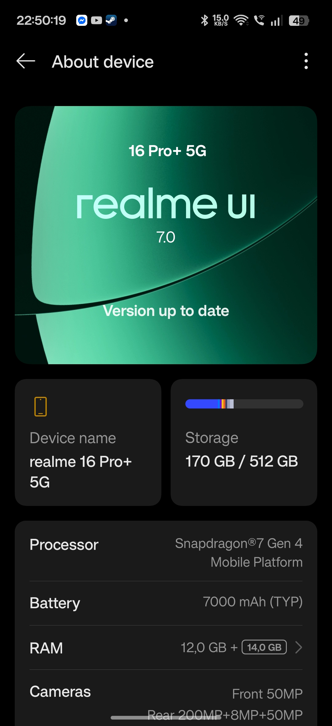 Nowy realme 16 Pro+ dostępny jest w wersji z 8 GB lub 12 GB pamięci RAM typu LPDDR5X oraz 256 GB lub 512 GB pamięci masowej typu UFS 3.1. Zestawy pamięciowe dostępne są w zestawach 8/256 oraz 12/512. Do mnie dotarła ta bogatsza wersja pamięciowa.