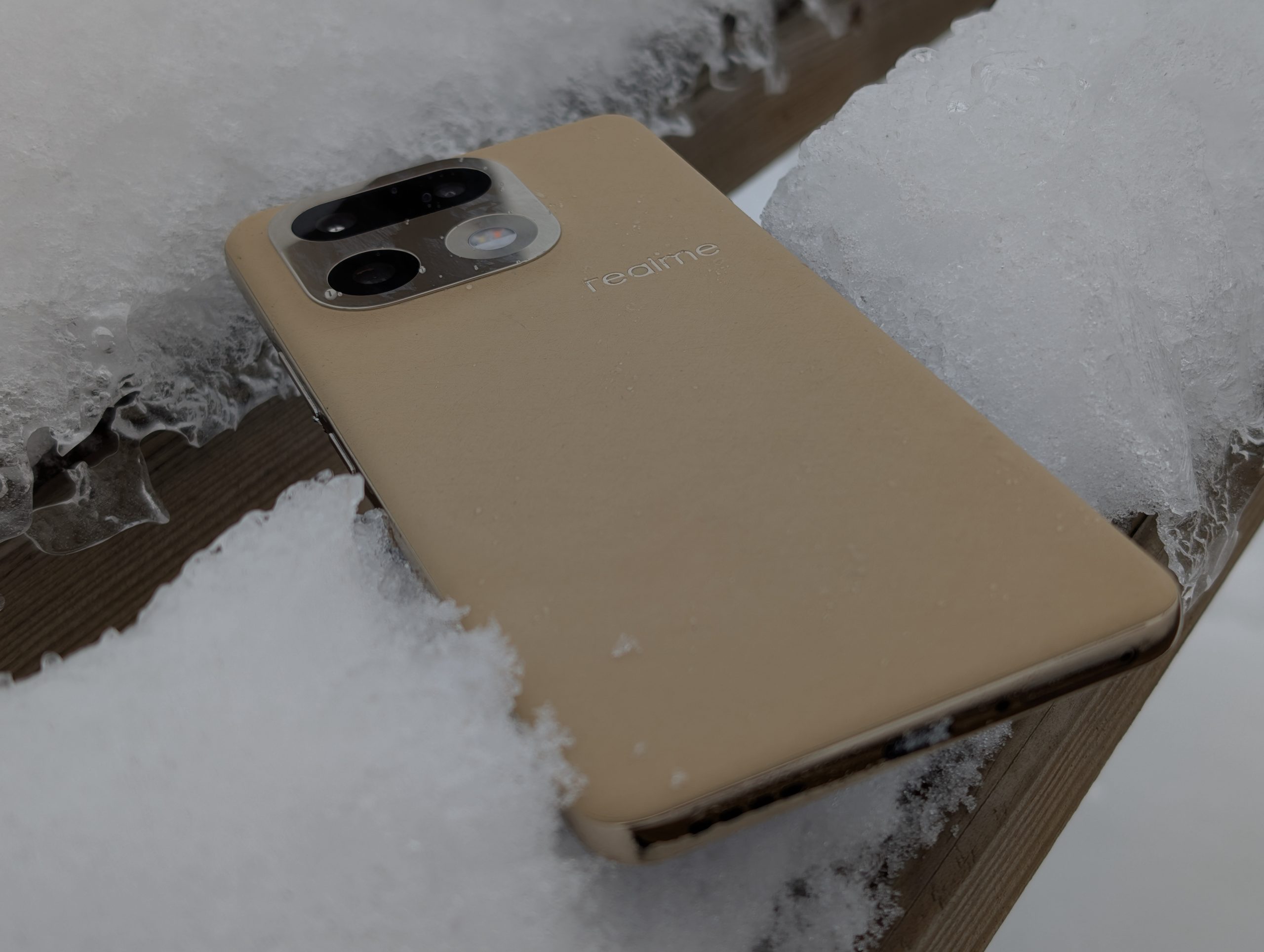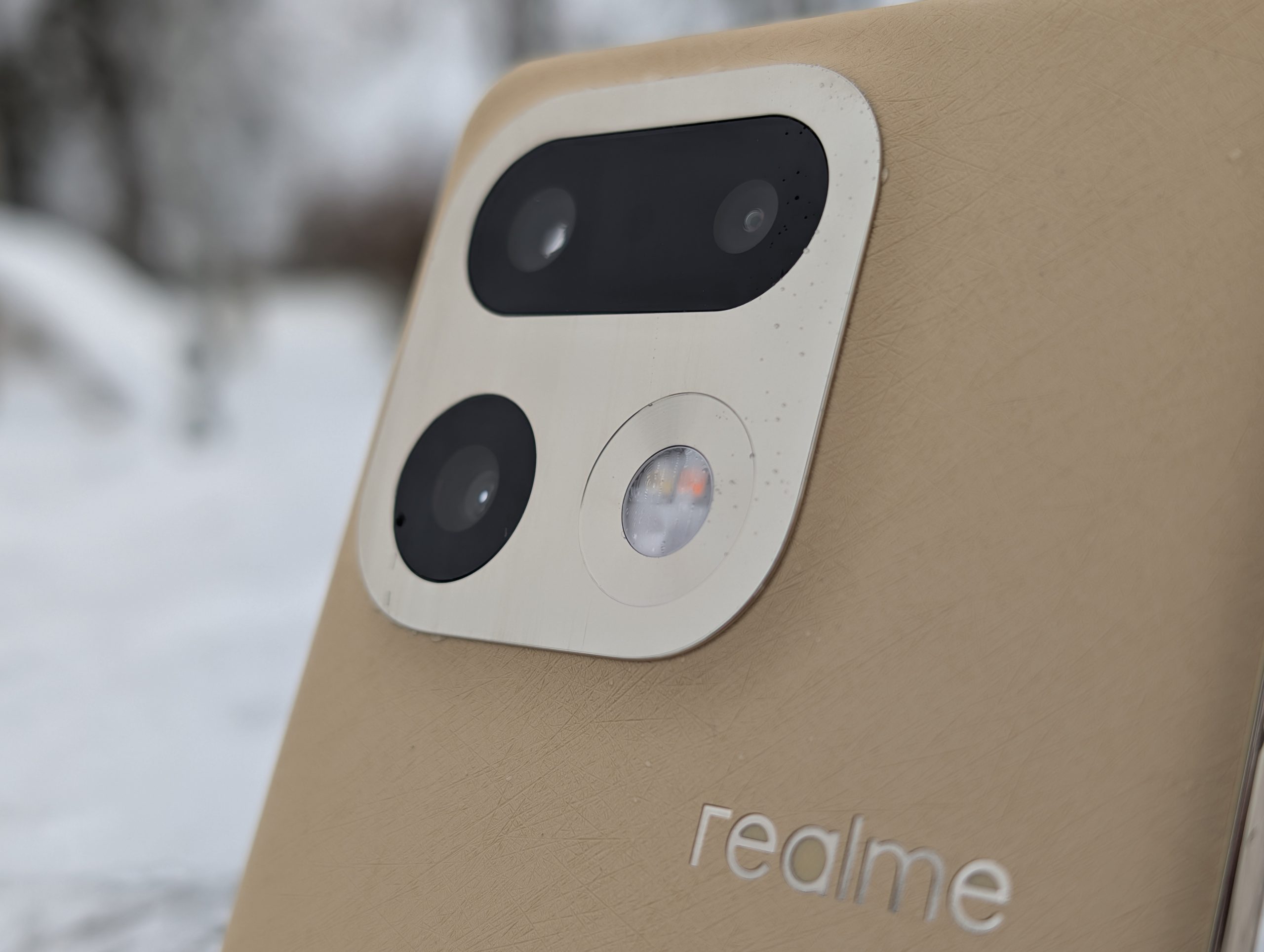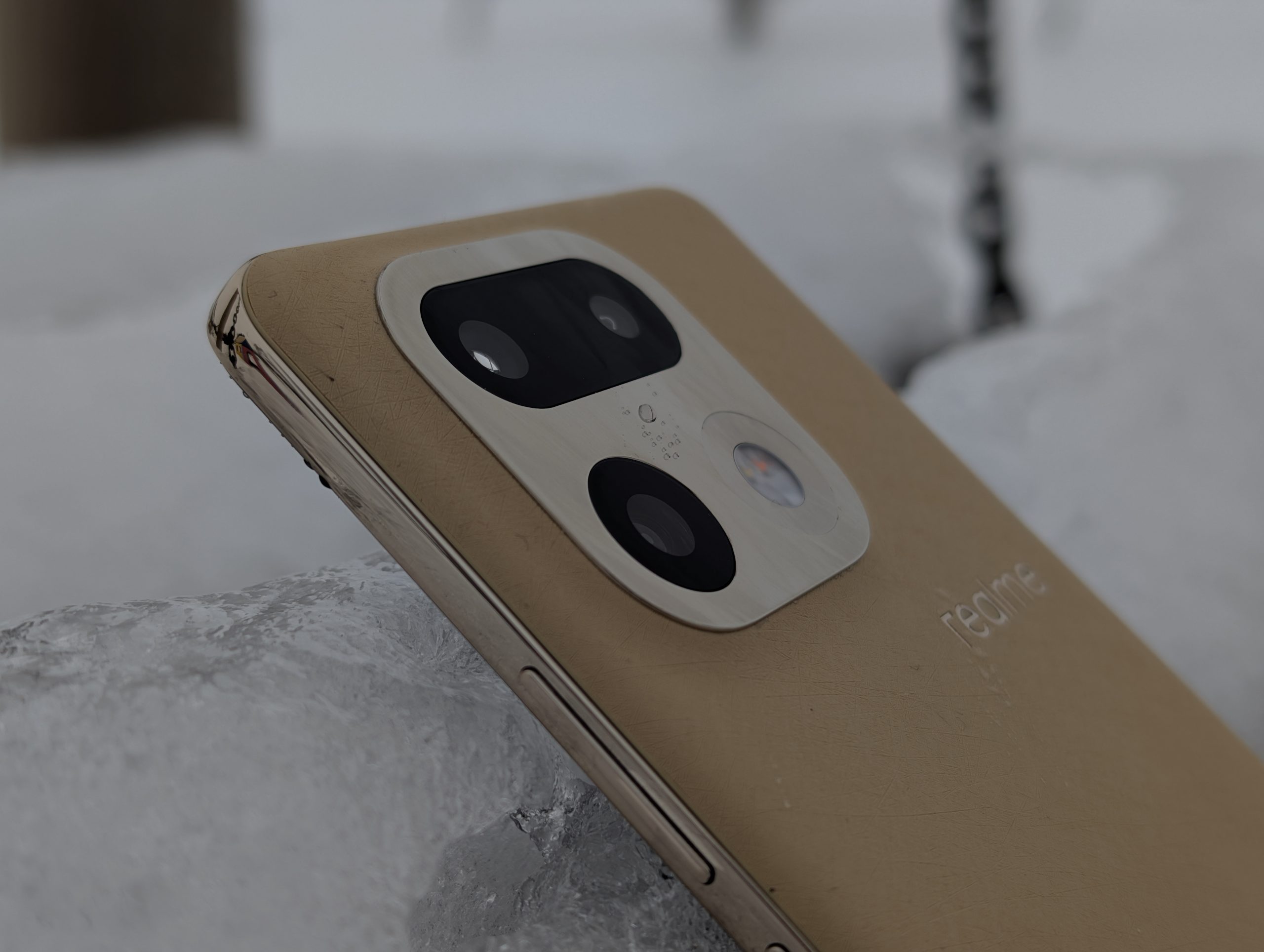 A skoro o wygodzie mowa, to muszę wyrazić zadowolenie z innego powodu. Wygląda na to, że wracamy do zaokrąglonych boków urządzenia, bez ostrych, kanciatych krawędzi. Dzięki temu urządzenia nawet z wielkim ekranem mieszczą się w dłoni wygodnie i sprawiają wrażenie mniejszych. Trend zapoczatkowany przez Apple i linię iPhone 12 w 2020 roku, który z czasem zaczęli zgapiać inni producenci może nareszcie zacząć zanikać. Może to moje osoboste zdanie, ale na prawdę jestem w stanie poświęcić trochę pojemności baterii, aby urządzenie nie miało bryły cegły. realme 16 Pro+ bardzo wygodnie i przyjemnie trzyma się w dłoni. Do złotego koloru plecków dopasowano kolor aluminiowej ramki wokół urządzenia oraz wyspy aparatów.