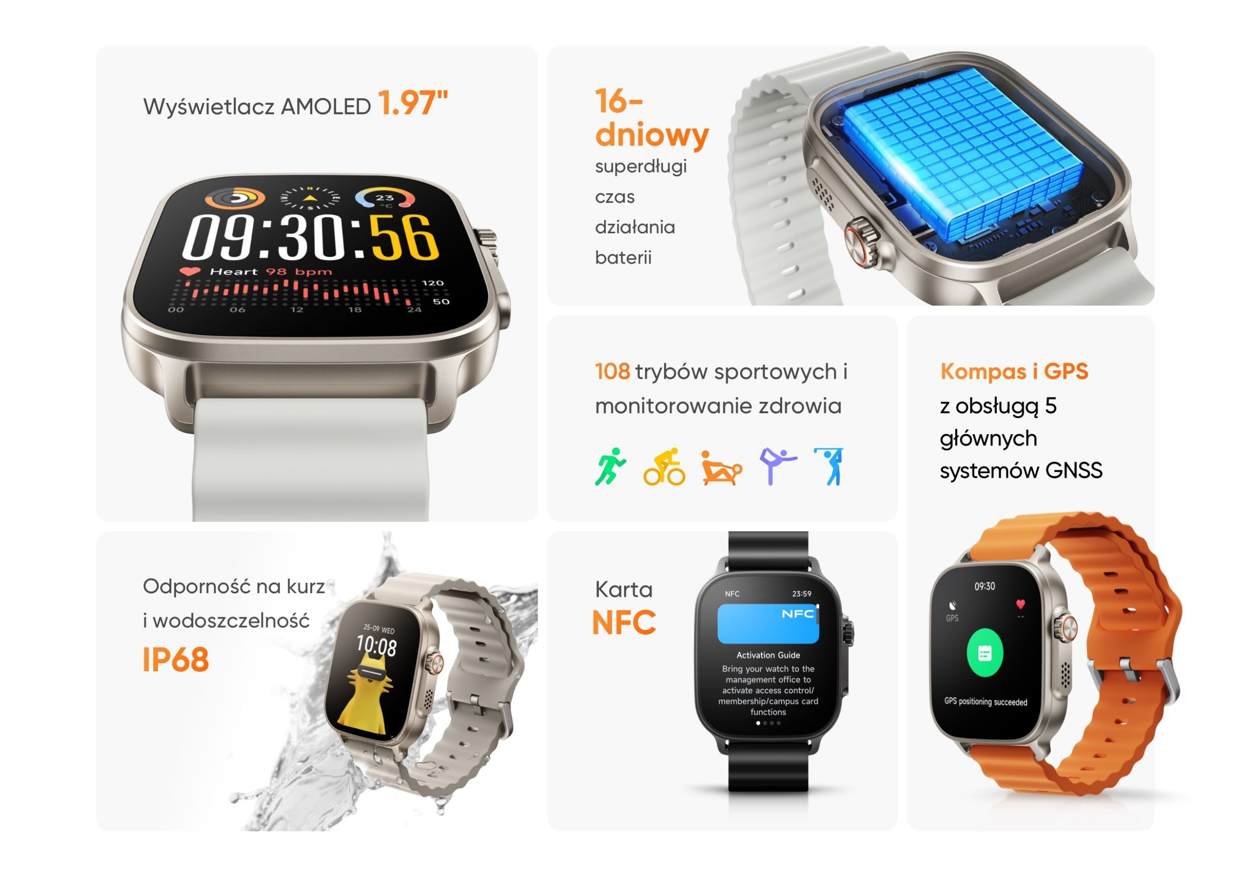 Nowy smartwatch obsługuje 108 trybów sportowych. Każdy trening można monitorować pod kątem 15 różnych wskaźników wydajności, a dla osób, które potrzebują większej kontroli, przygotowano również spersonalizowane treningi i zestawy ćwiczeń rozciągających. To sporo jak na zegarek w tym segmencie cenowym, choć oczywiście nie jest to poziom profesjonalnych zegarków sportowych.