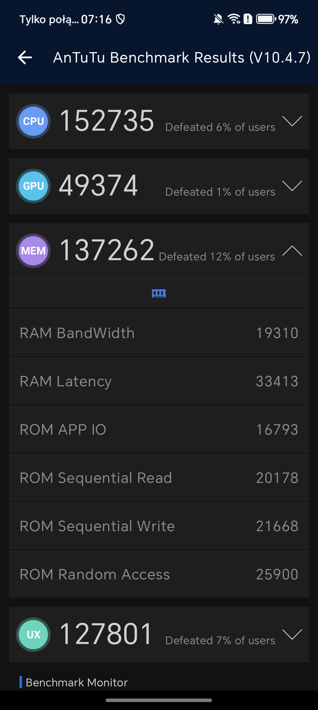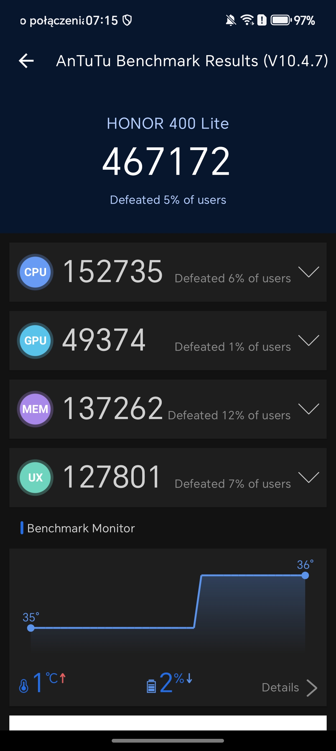 Aby dokładniej ocenić wydajność HONOR 400 Lite, przeprowadziłem kilka popularnych testów benchmarkowych, które pozwalają porównać ten model z innymi smartfonami dostępnymi w tej samej kategorii cenowej. Testy te uwzględniają zarówno wydajność procesora, jak i ogólną sprawność urządzenia w zadaniach wymagających większej mocy obliczeniowej, takich jak gry czy aplikacje multimedialne. Benchmarki pozwalają również ocenić zdolności telefonu do zarządzania wielozadaniowością oraz jego stabilność przy dłuższym obciążeniu. Powyżej znajdują się wyniki z testów, które wykonałem na HONOR 400 Lite, dające pełniejszy obraz jego możliwości w porównaniu z innymi urządzeniami w tej samej półce cenowej.