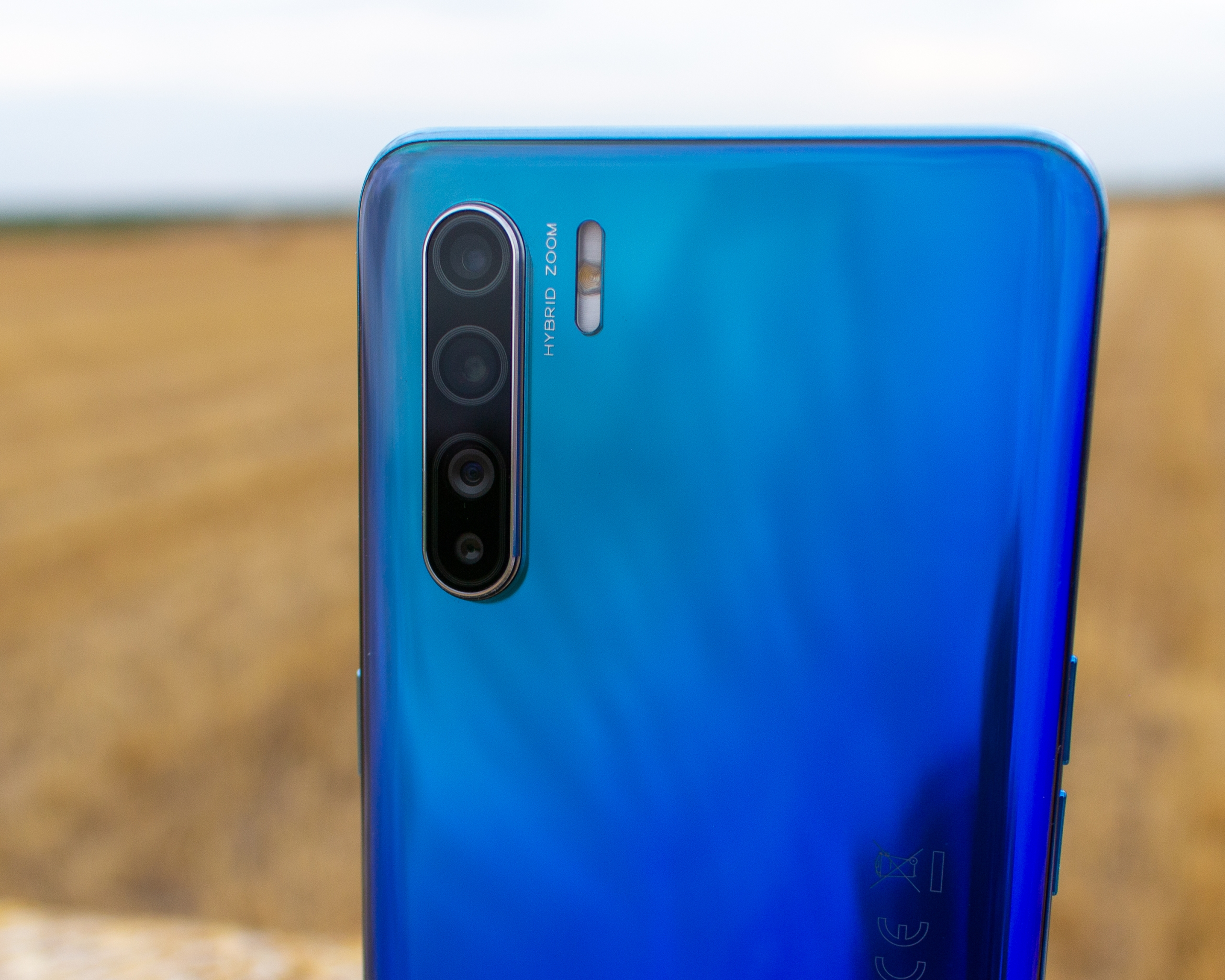 Reno3 wygląda dobrze, ale mam do niego jedno wielkie zastrzeżenie… nie pasuje do serii Reno. W jego designie nie ma absolutnie niczego innowacyjnego, elementu odróżniającego od konkurencji jak wysuwany aparat w “płetwie rekina” znany z poprzednika, którego również miałem szansę testować. Ot, zwykły telefon z notchem i czterema wystającymi aparatami ułożonymi w pionową wyspę. Plusem jest za to turkusowy gradientowy kolor, który wpada w fiolet.