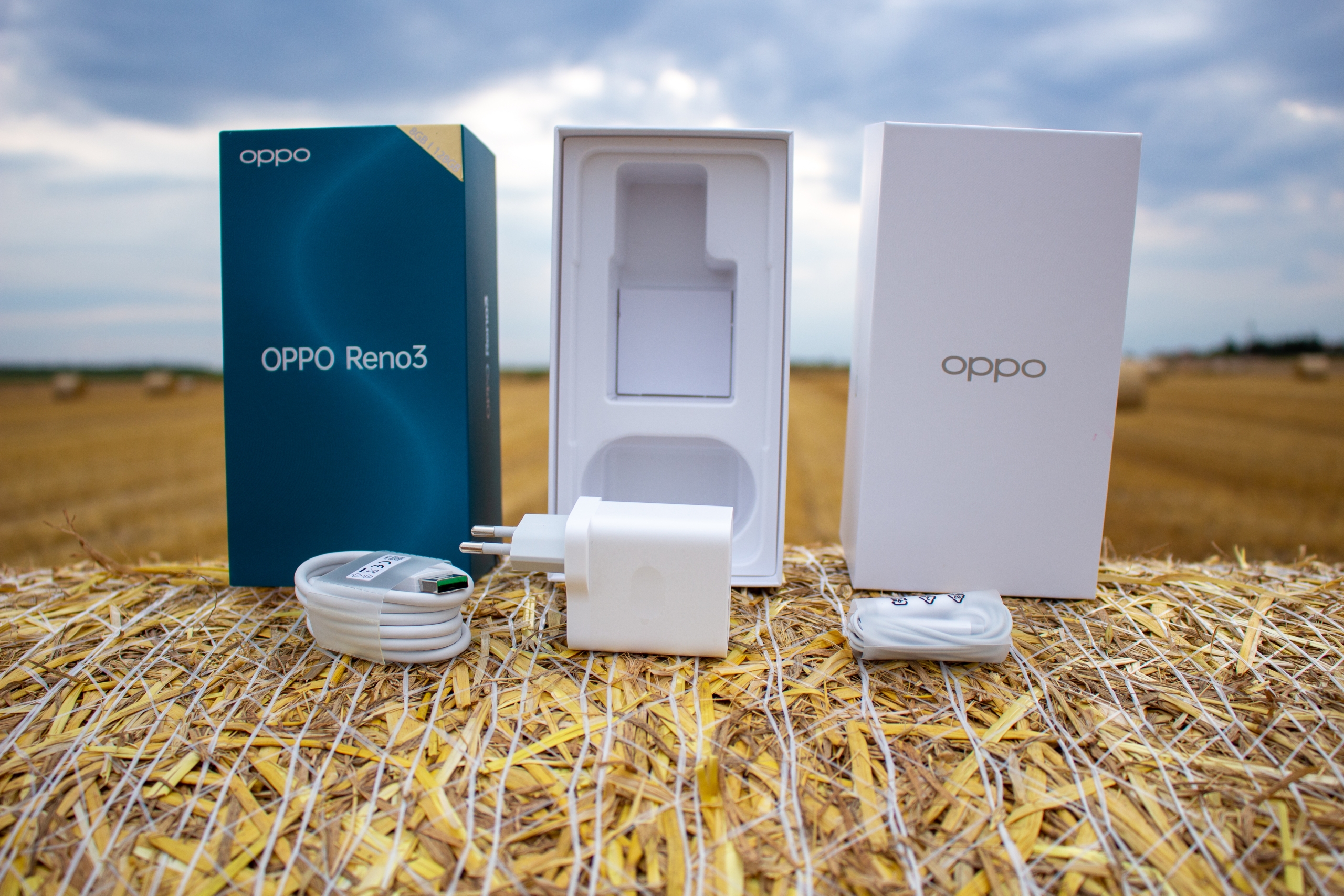 OPPO Reno3 przychodzi w pudełku, które koresponduje kolorystycznie z kolorem, w jakim jest telefon. Opakowanie najpierw należy wysunąć z tej kolorowej osłony, która pokryta jest drobną fakturą, a napisy połyskują. W tradycyjnym białym kartoniku znajdziemy oprócz telefonu etui, słuchawki douszne, szybką ładowarkę, przewód USB typu C oraz papierologię.