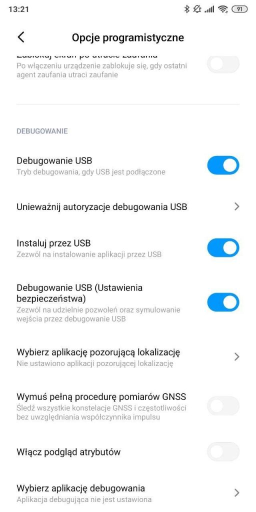 UWAGA! Na smartfonach Xiaomi oprócz opcji “Debugowanie USB”, musimy również włączyć “Instaluj przez USB” oraz “Debugowanie USB (Ustawienia bezpieczeństwa)”!
