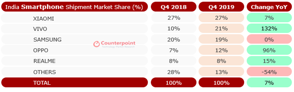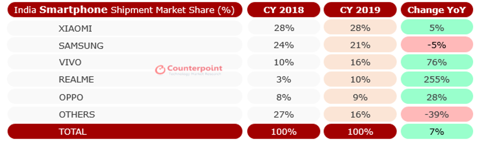 Udział chińskich marek osiągnął rekordowy poziom 72% w 2019 roku, gdzie w 2018 r. było to 60%. Wszyscy główni gracze z Chin zwiększyli swoją sprzedaż zarówno online, jak i stacjonarną, aby zdobyć udział w rynku. Vivo zwiększyły zasięg online dzięki serii Z i U, natomiast Xiaomi, realme i OnePlus skupili się na punktach sprzedaży offline. W ciągu ostatnich czterech lat Xiaomi, Vivo i OnePlus wzrosły odpowiednio 15x, 24x i 18x.