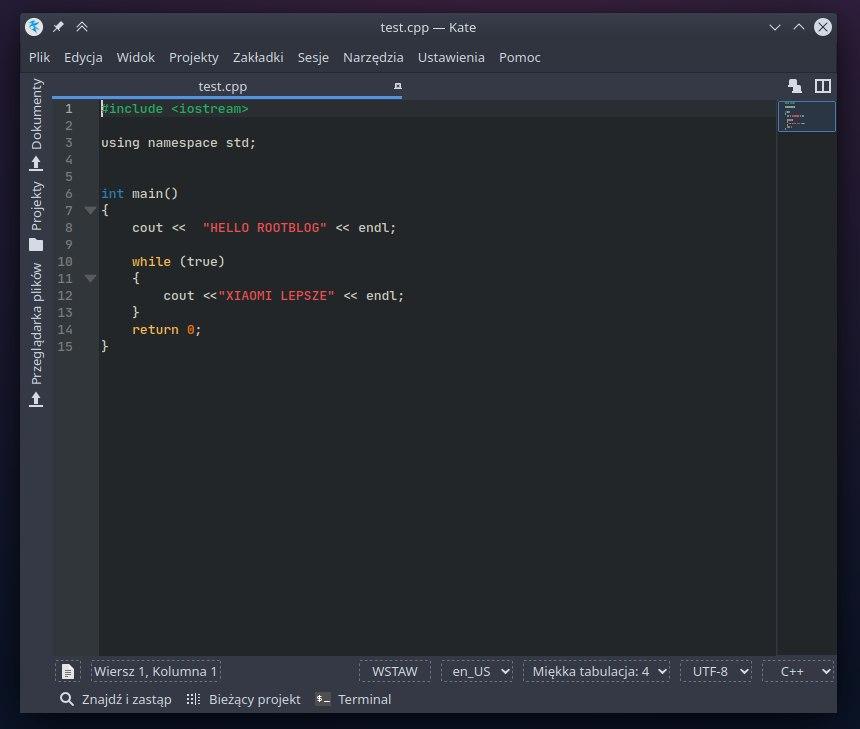 Niekiedy jednak nie potrzebuję tak rozbudowanego (i zarazem dosyć ciężkiego) edytora kodu. W tych momentach sięgam po coś prostszego. Zazwyczaj jest to wbudowany edytor tekstu w system, a w przypadku KDE Neon jest to Kate. Kate wygląda dosyć prosto, jednak, podobnie jak VSCode, skrywa w sobie ogromną liczbę funkcji – o wiele większą niż inne, linuxowe edytory (chociażby xed). Kate jest dostępny również na komputery z systemem Windows.