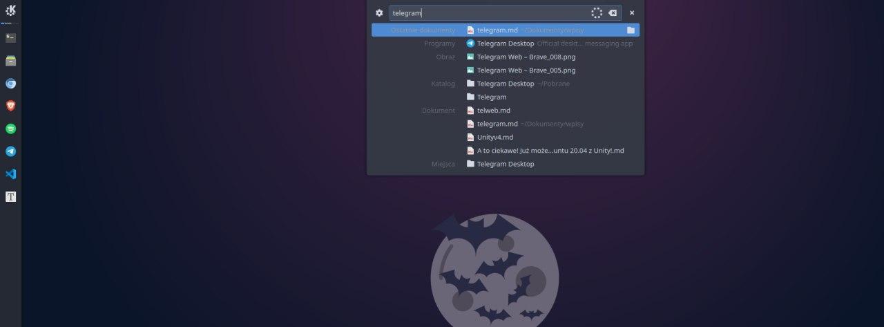 KRunner to kolejna funkcja ściśle związana z KDE Plasma. Jest to swego rodzaju wyszukiwarka/program uruchomieniowy, który skanuje cały komputer i szuka fraz przez nas wpisanych. Przykład? Proszę bardzo. Chcę uruchomić program Packet Tracer. Naciskam skrót klawiszowy, który włącza KRunner (domyślnie jest to Alt + Spacja, natomiast u mnie: Alt + Q) i wpisuje “packet”, a następnie naciskam Enter i voilà! Chcę uruchomić dokument podsumowanie.md? Włączam KRunner i wpisuje pierwsze litery szukanej frazy. Jak więc widzicie, KRunner pozwala wyśwetlić dany katalog lub plik, a także program czy daną kategorię ustawień.