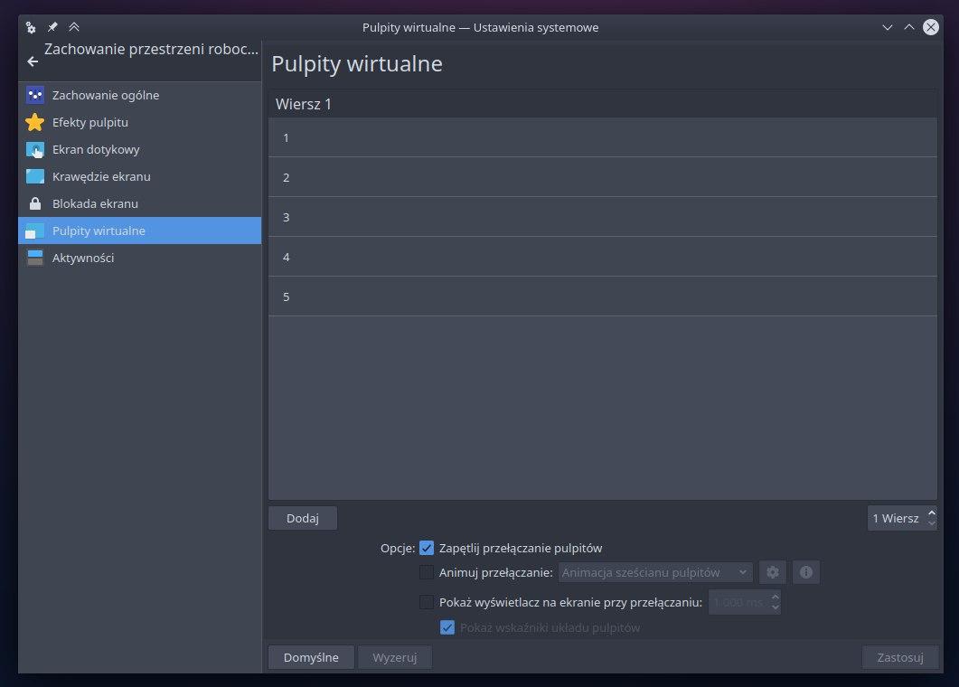 To chyba jedna z najczęściej wykorzystywanych funkcji Linuxa. Tak, wirtualne pulpity pierwszy raz zostały zaprezentowane w Linuxie i aktualnie jest to element dostępny w przeróżnych środowiskach graficznych. Kilka lat został również skopiowany do Windowsa. W skrócie, dzięki tejże funkcjonalności możemy mieć po kilka przestrzeni roboczych, to sprawia, że przeskakiwanie między aplikacjami jest bardzo wygodne. Mam 5 statycznych pulpitów, gdzie zazwyczaj na pierwszym mam włączoną przeglądarkę internetową oraz Typorę, na drugim Spotify i inne multimedia, na trzecim arkusz kalkulacyjny, a na czwartym zazwyczaj pracuję z edytorami kodu lub innymi środowiskami programistycznymi. Piąty najczęściej mam czysty, aby tam uruchomić coś, z czego korzystam rzadko.