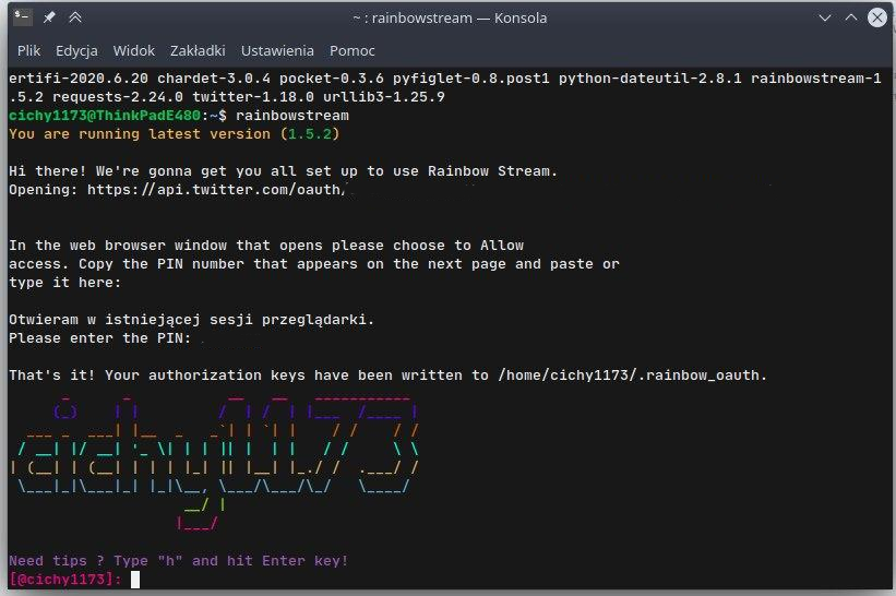 Przy pierwszym uruchomieniu program włączy przeglądarkę internetową z ekranem logowania do Twittera. Po zalogowaniu się otrzymamy kod PIN, który należy przepisać do Terminala. Po zatwierdzeniu przyciskiem Enter powinniśmy zobaczyć nasz nick napisany wielkimi literami.