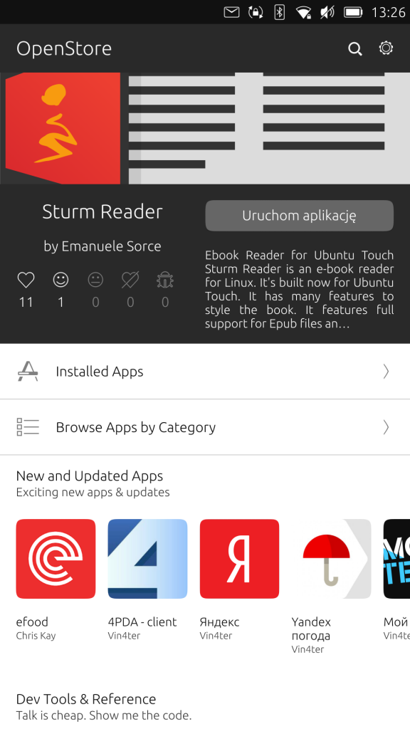 Niestety brakuje tutaj aplikacji bankowych, czy nawet większości komunikatorów. To też sprawia, że nasz smartfon nie sprawdza się w wielu sytuacjach. Co prawda, trwają pracę nad tym, aby umożliwić uruchamianie programów z Androida, jednak zapewne wymaga to ogromnego dopracowania i nigdy nie będzie idealne. Aby móc z tego skorzystać należy zmienić kanał na Dev. Niestety, ten element nie był u mnie możliwy i w trakcie zmieniania kanału za każdym razem wyskakiwał błąd.