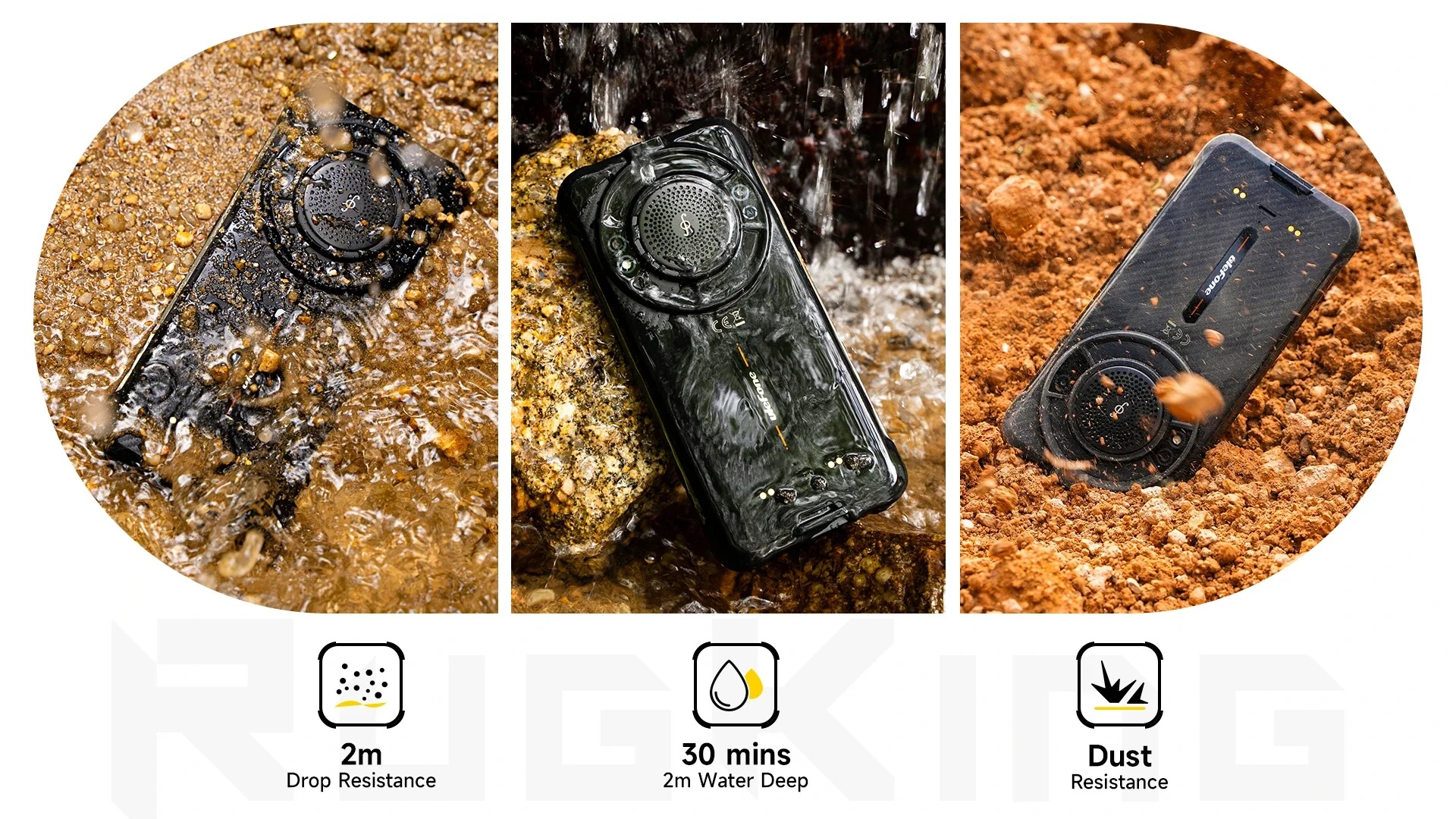 Jak na „pancerniaka” przystało, RugKing spełnia normy IP68, IP69K oraz wojskowy standard MIL-STD-810H. Dzięki temu wytrzymuje zanurzenie w wodzie do 2 metrów przez 30 minut, jest odporny na pył, wstrząsy i upadki z wysokości około 2 metrów. Smartfon jest przy tym masywny, co raczej nikogo nie powinno dziwić. Jego grubość wynosi 18,3 mm, a waga 397 gramów, co może być uciążliwe przy codziennym noszeniu, ale jednocześnie potwierdza jego solidność.