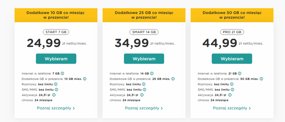 To będzie chyba najczęściej brany pakiet. Kosztuje 34.99 zł netto miesięcznie, w zamian za to mamy: