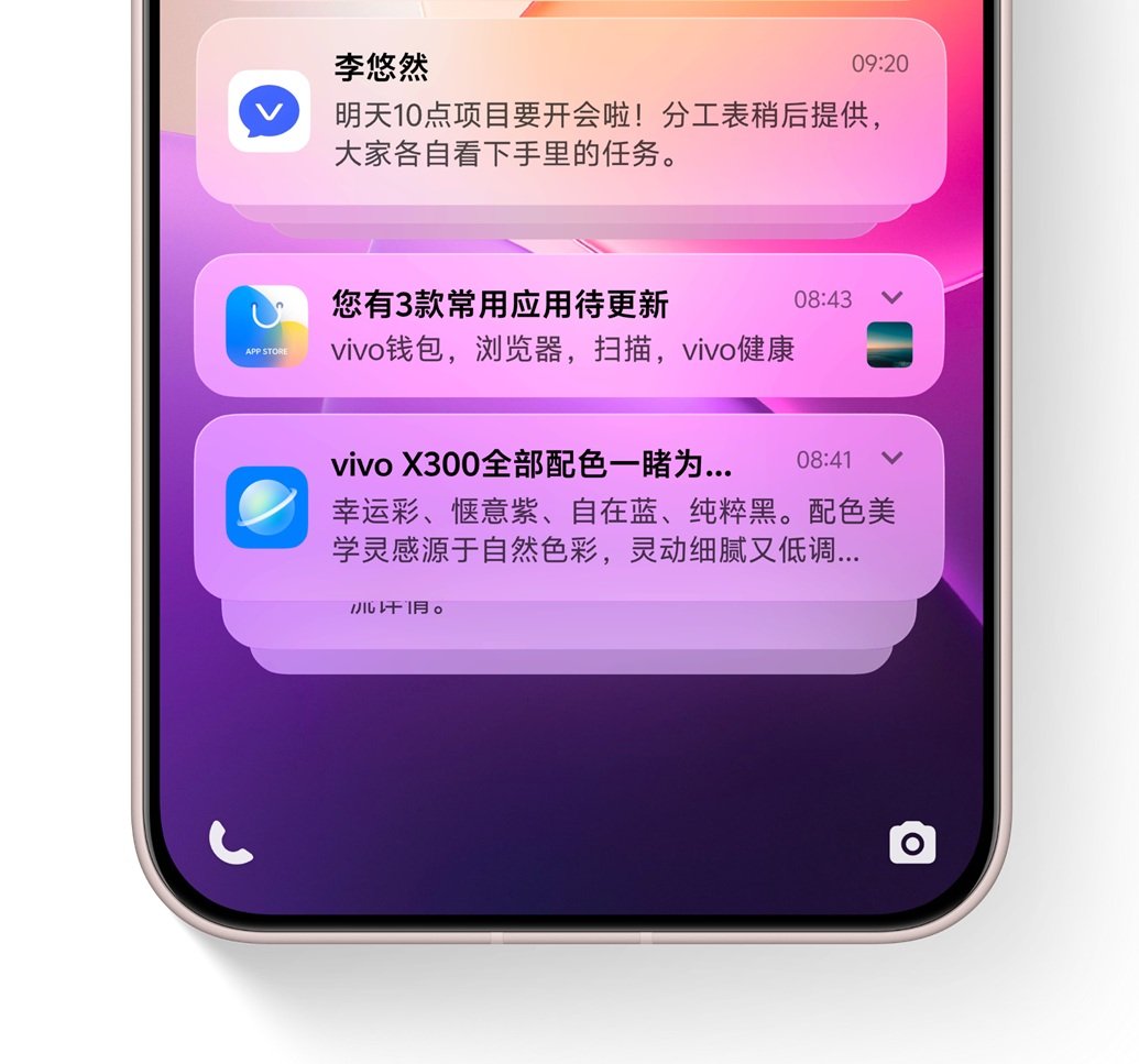 Zmieniono także ekran blokady, na którym pojawił się zegar z animowaną czcionką, który z kolei można skalować, a powiadomienia łączą się w jeden płynny strumień. Centrum sterowania zyskało nowy układ, a półprzezroczyste panele dają efekt „mrożonego szkła”. Choć wygląda to świetnie, krytycy nie bez racji zauważają, że vivo zainspirowało się Apple aż za bardzo.