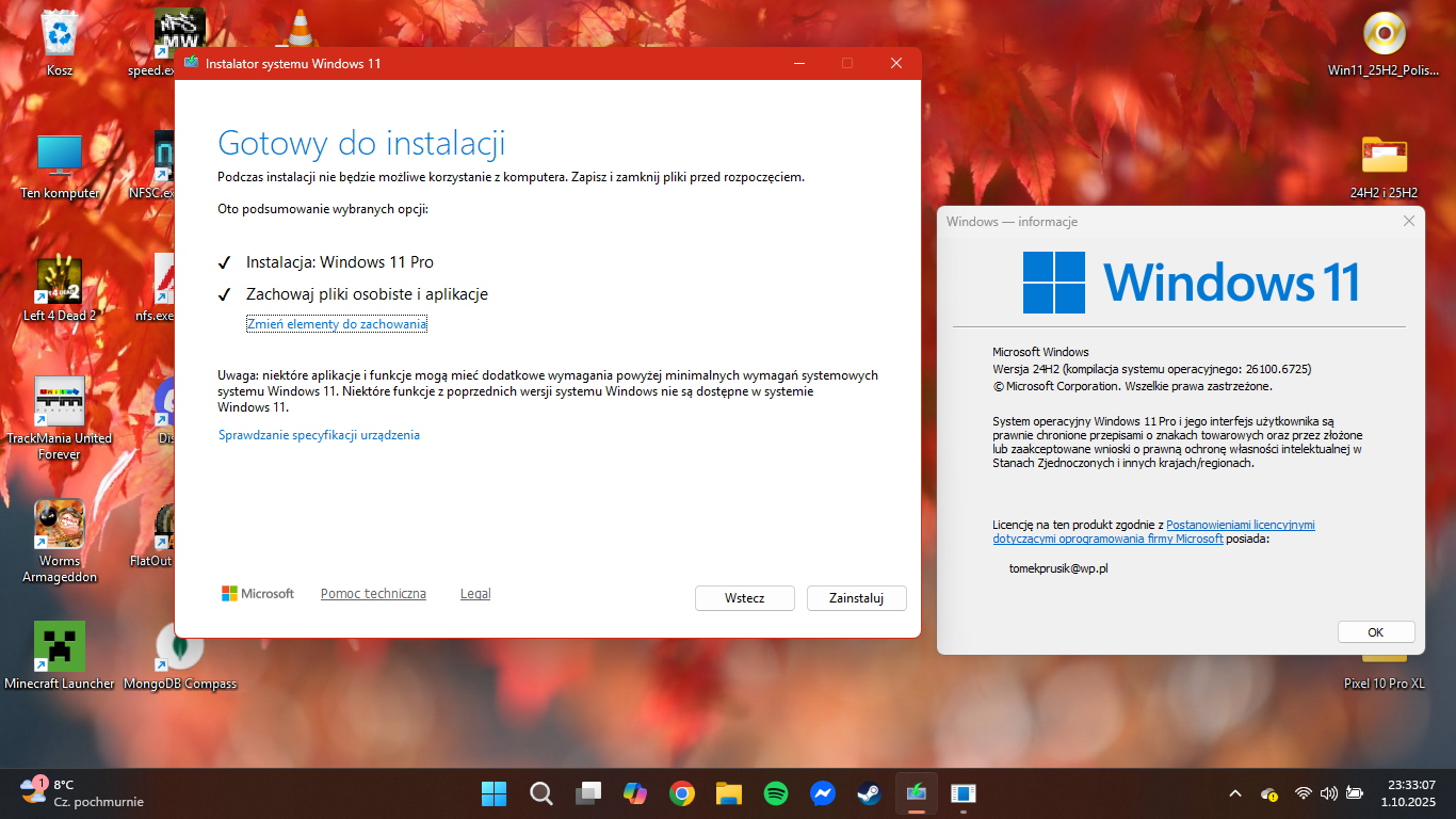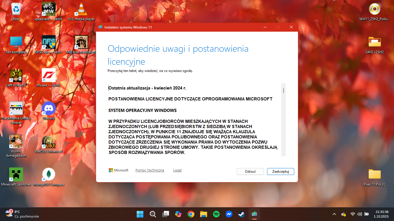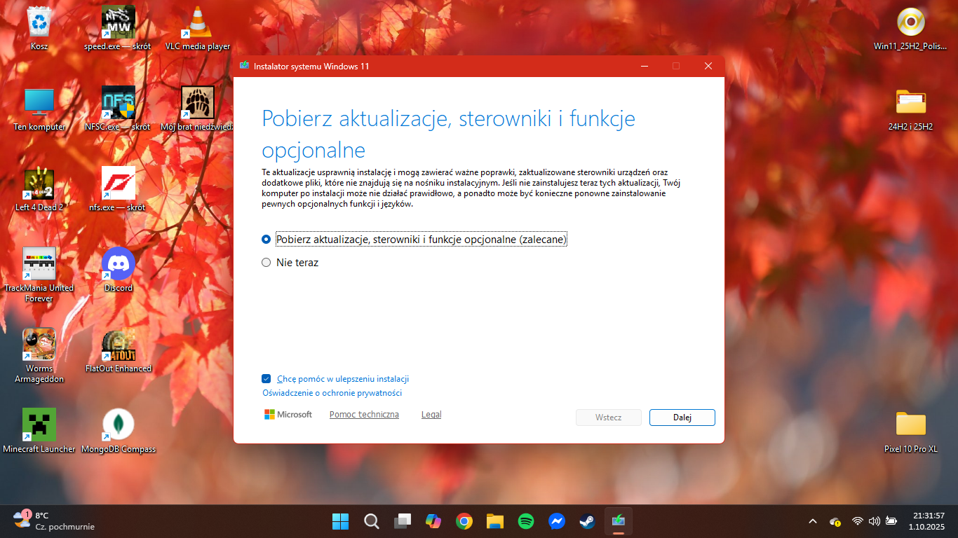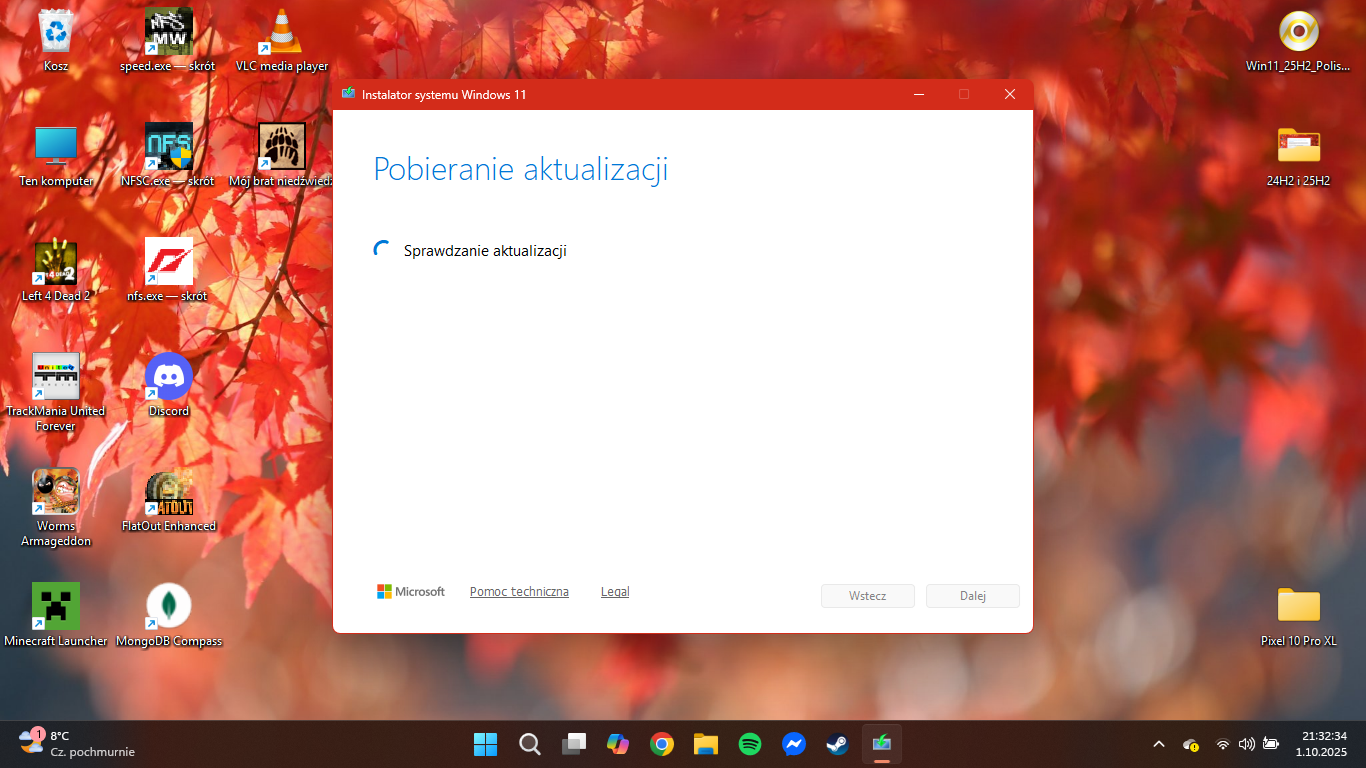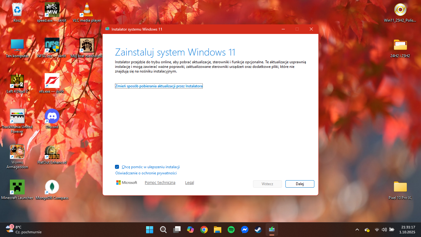 Musiałem zasięgnąć innych sposobów. Jeszcze do niedawna Microsoft miał kilka narzędzi do aktualizacji systemu, osobno narzędzie do aktualizacji z systemu Windows 10 do Windows 11 i osobno narzędzie do aktualizacji systemu Windows 11 ze starszych do nowszych wersji. Drugie z tych narzędzi wycofano, więc zarówno rok temu, jak i w tym roku pobierałem cały obraz ISO. Okazuje się jednak, że narzędzie Asystent instalacji systemu Windows 11 służący do aktualizacji z Windowsa 10 do Windowsa 11, może również bez problemu posłużyć do aktualizacji Windowsa 11 ze starszej wersji do nowszej. Ale o tym dowiedziałem się za późno, więc wczorajszy wieczór spędziłem na oczekiwaniu aż mój powolny internet pobierze ważący aż 7,09 GB obraz ISO systemu Windows 11 w wersji 25H2. Dla porównania obraz ISO zeszłorocznej wersji 24H2 miał jedynie 5,31 GB. Nie spodziewałem się, że obraz systemu tak bardzo urośnie. Asystenta aktualizacji oraz obrazy ISO możemy znaleźć na oficjalnej stronie Microsoftu pod tym linkiem.