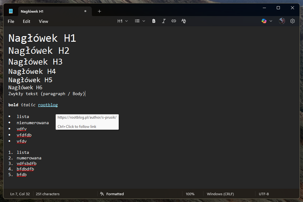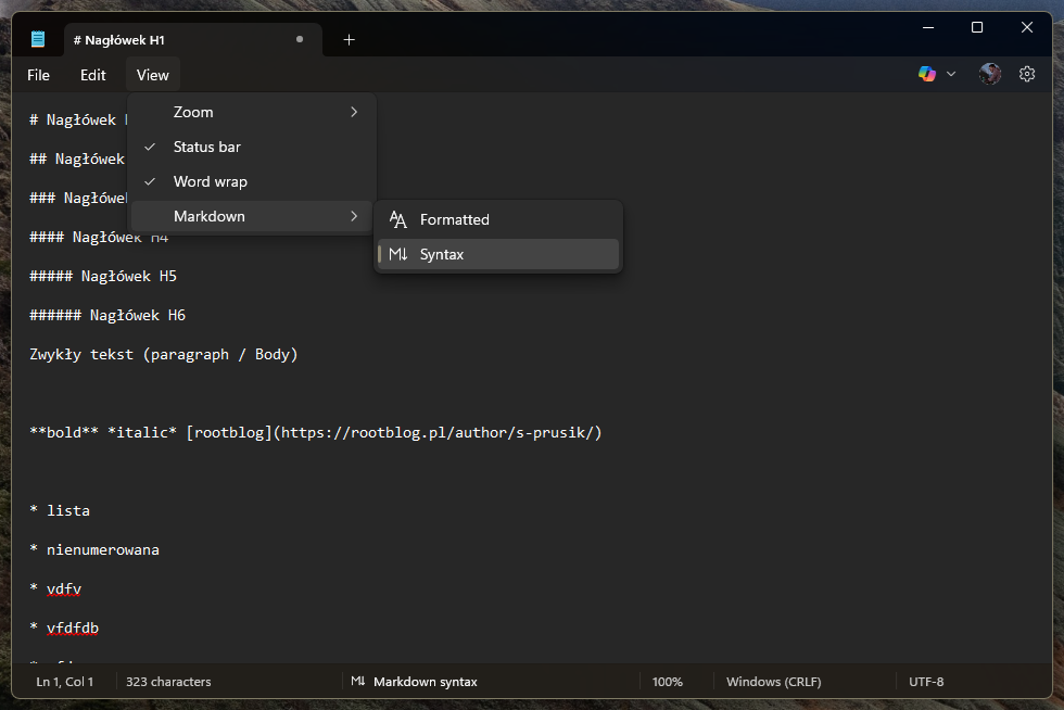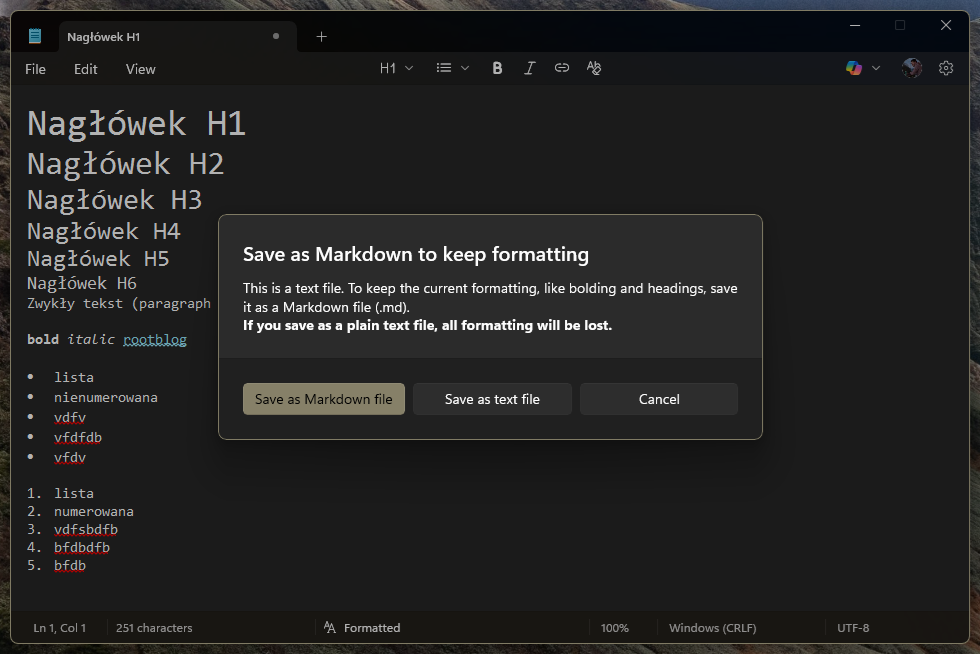 A oto efekt finalny! Opcje formatowania widnieją na pasku menu, tuż obok opcji Plik, Edytuj, Widok. Mamy tam listę z nagłówkami od H1 do H6 + Body, dalej mamy opcję tworzenia listy nienumerowanej i listy numerowanej, następnie opcje takie jak pogrubienie, kursywa i wklejanie linku. A na samym końcu znajduje się przycisk, który usuwa całe formatowanie z tekstu. W opcjach widoku możemy zmienić sposób wyświetlania z formatowanego na syntax. Przy zapisie pliku program nas zapyta czy życzymy sobie zapisać go w formacie Markdown czy jako zwykły plik tekstowy, przy czym wytłumaczy nam, że tylko Markdown pozwoli zachować formatowanie tekstu.