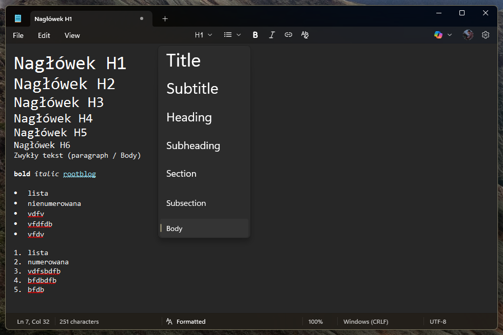 Markdown, o którego wzbogacił się Notatnik to format tekstowy pozwalający na proste formatowanie tekstu. Mamy tu do dyspozycji 6 rodzajów nagłówków (6 rozmiarów) poza standardowym tekstem. Do tego wsparcie dla numerowanych i nienumerowanych list, pogrubienie tekstu, kursywa i wstawianie linków. Tylko tyle i aż tyle. Nie jest to poziom stylizacji godny Microsoft Worda, ale w zupełności wystarczy do szybkich i prostych notatek, które teraz mogą być lepiej czytelne.