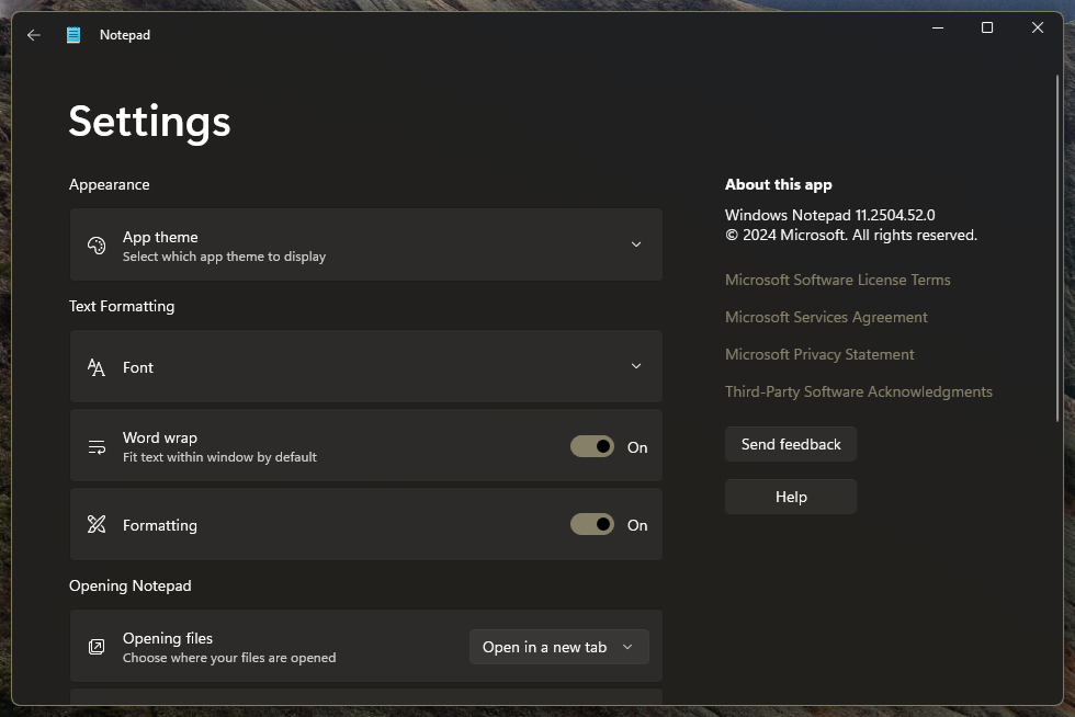 Oficjalny blog Windows podzielił się informacją, że testowe kanały Canary oraz Dev w programie Windows Insider otrzymują aktualizację Notatnika do wersji 11.2504.50.0, która wprowadza wsparcie dla prostego formatowania tekstu w formacie Markdown. Jako, że sam jestem członkiem programu Windows Insider (jestem w kanale Canary na kompilacji 27868), to ochoczo zaktualizowałem Notatnik przez Microsoft Store. Po uruchomieniu aplikacji… nic się nie zmieniło. A w ustawieniach programu widzę, że jest to wersja 11.2504.52.0, więc nawet nowsza niż wskazuje artykuł na oficjalnym blogu Windows.