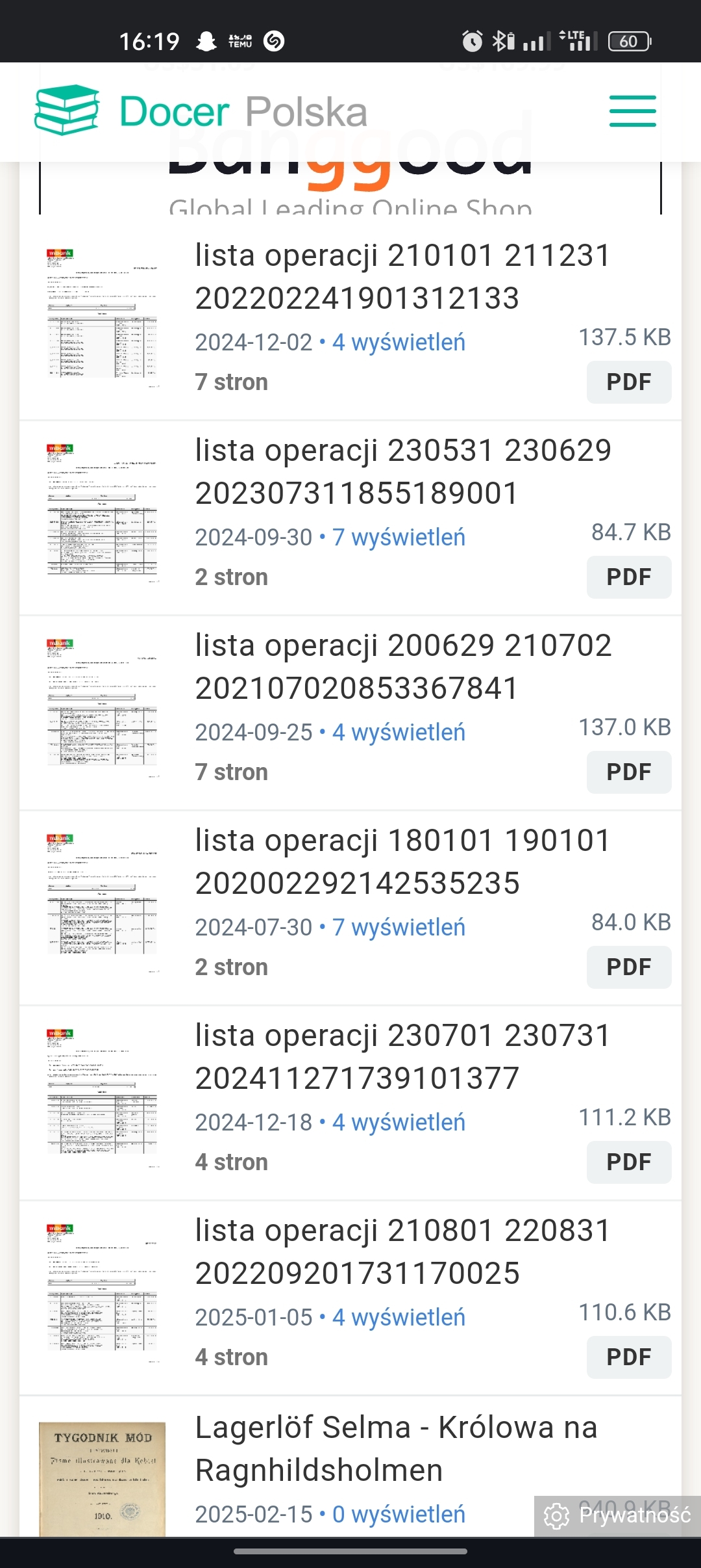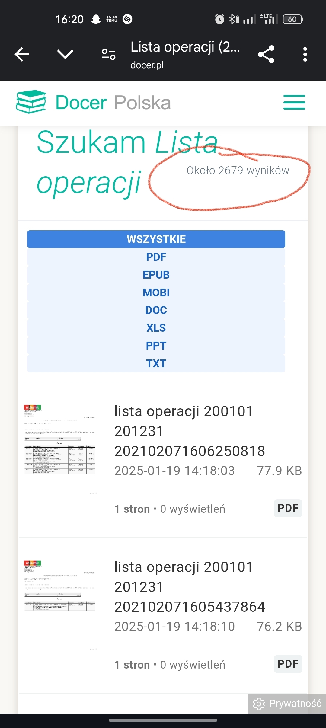 Wczoraj zostałem poinformowany że moje dane osobiste śmigają po sieci. Sprawdziłem i jak się okazało był to wyciąg z konta pod kredyt hipoteczny. Chciałem się dowiedzieć skąd jest wyciek więc zadzwoniłem do kolejno napotkanej osoby w tych plikach. Właścicielka firmy nic nie wiedziała że jej wyciągi z kont firmowych latają po sieci ale też brała hipotekę ( nazwiska klientów , opłaty, wypłaty dla pracowników,). Aktualnie sprawa podsunąłem policji i mBanku ( najwięcej dokumentów z tego banku było) dokumenty znikają z serwisu wyszukiwarka już nie działa . Możecie wpisać w google “lista operacji” to jeszcze niektóre dokumenty będą widoczne . Lub wpiszcie swoje imię i nazwisko z dopiskiem Docer i sprawdzicie czy nigdzie was nie ma. W dalszej części wrzucam więcej screenów