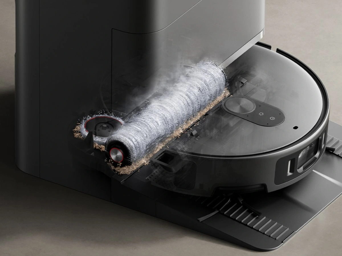 Integralną częścią zestawu jest rozbudowana stacja dokująca, która znacząco ogranicza konieczność ręcznej obsługi urządzenia. Odpowiada ona za opróżnianie pojemnika na kurz, uzupełnianie wody, a także czyszczenie systemu mopującego w temperaturze sięgającej około 85°C. Dodatkowo mopy są suszone ciepłym powietrzem, co ma zapobiegać powstawaniu nieprzyjemnych zapachów.